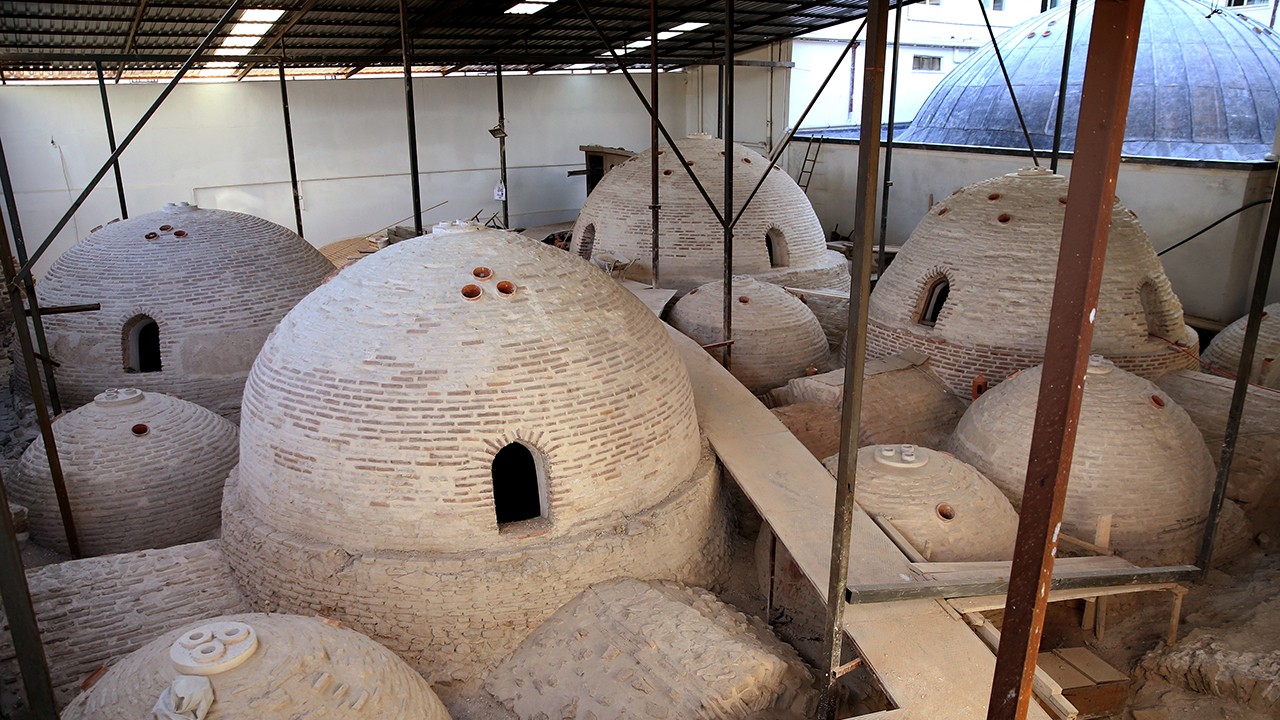 Konya'da bir girişimci, kentin geleneksel düğün pilavı menüsünü tarihi hamam manzaralı işletmesinde müşterilerine sunuyor.