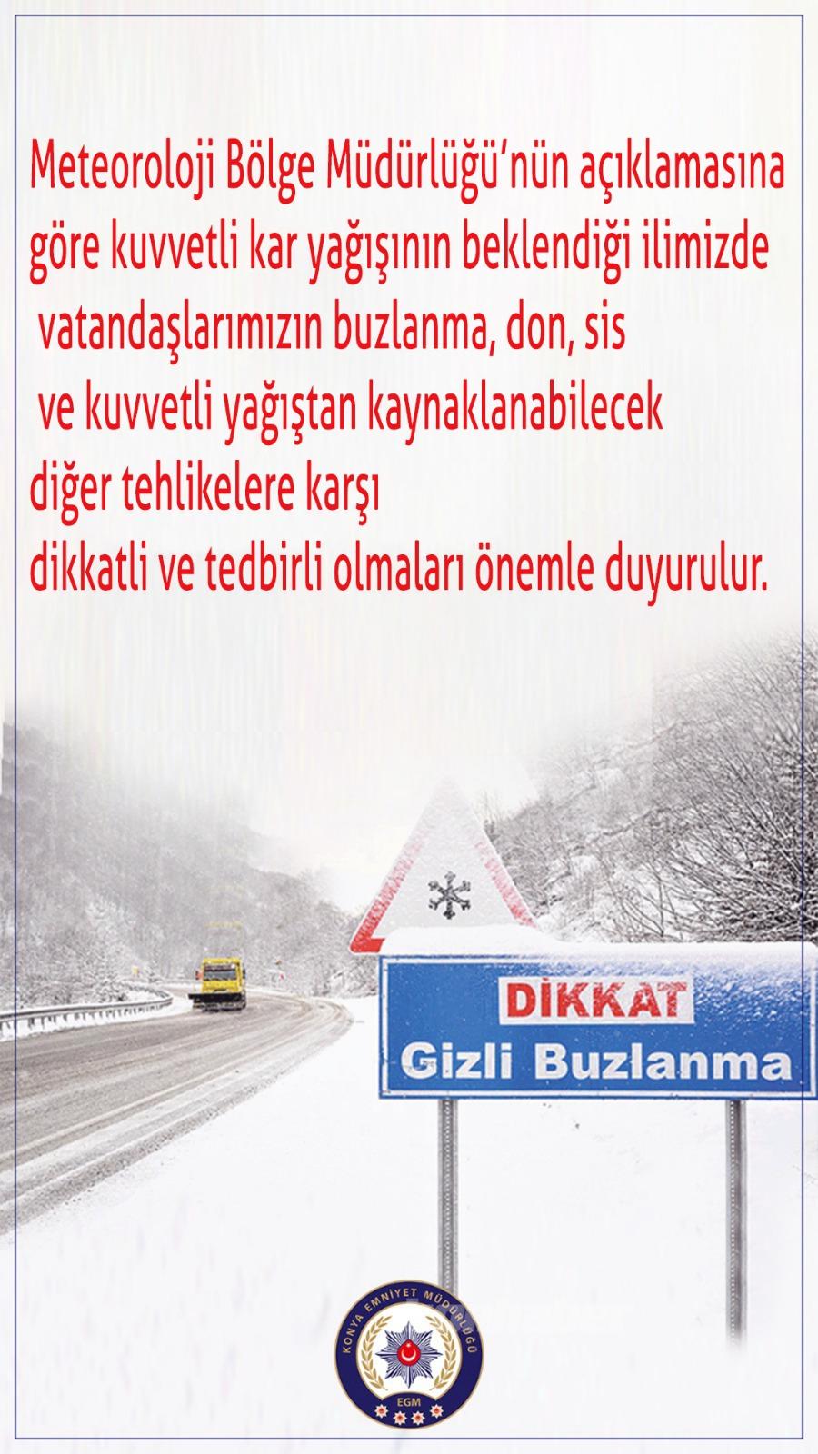 Konya İl Emniyet Müdürlüğü de Meteorolojinin uyarısı sonrası vatandaşları buzlanma, don, sis ve kuvvetli yağıştan kaynaklanabilecek diğer tehlikelere karşı dikkatli olmaları konusunda uyardı.
