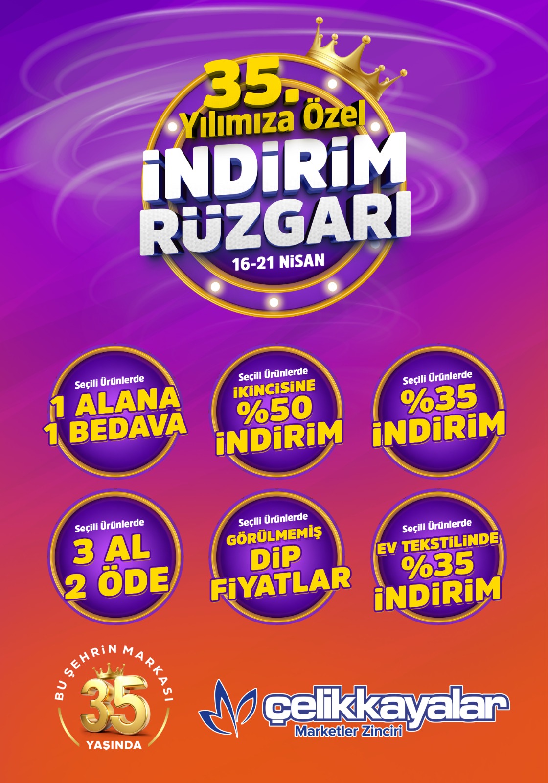 Çelikkayalar, 35. kuruluş yıl dönümünü 16 - 21 Nisan tarihleri arasında geçerli dev kampanyayla kutluyor. 335 üründe “1 alana 1 bedava”, ikinci ürüne %50 indirim ve seçili ürünlerde %35’e varan fırsatlar müşterileri bekliyor.