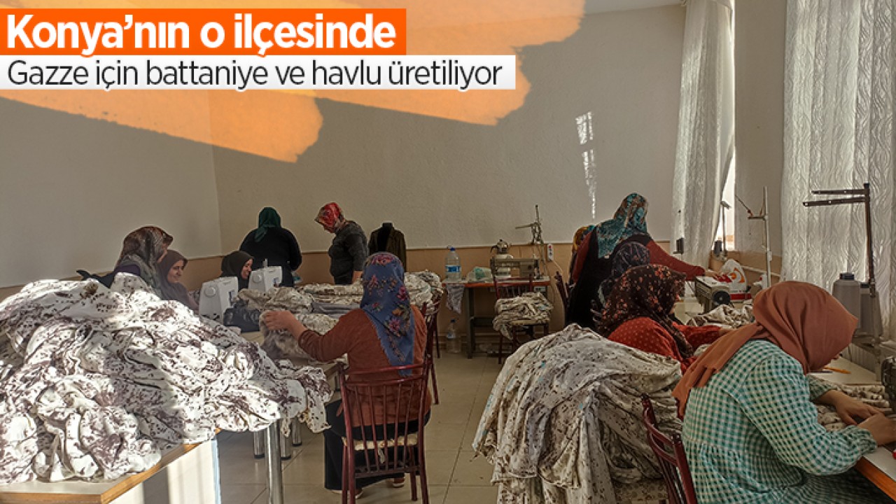 Konya Güneysınır Halk Eğitimi Merkezi'nde öğretmen ve kursiyerler Milli Eğitim Bakanlığı Hayat Boyu Öğrenme Genel Müdürlüğü'nce hazırlanan proje kapsamında, İsrail saldırıları altındaki Gazze'de bulunanlar için battaniye ve havlu üretiyor.