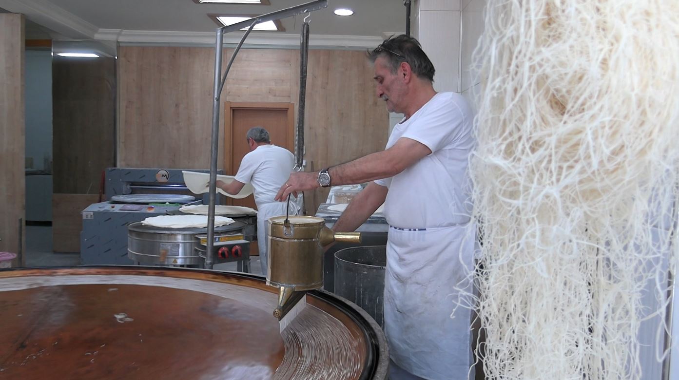 Geleneksel yöntemlerle bakır tepside hazırladığı tel kadayıf, damakları tatlandırırken Ramazan ayında vatandaşlardan yoğun ilgi görüyor.
