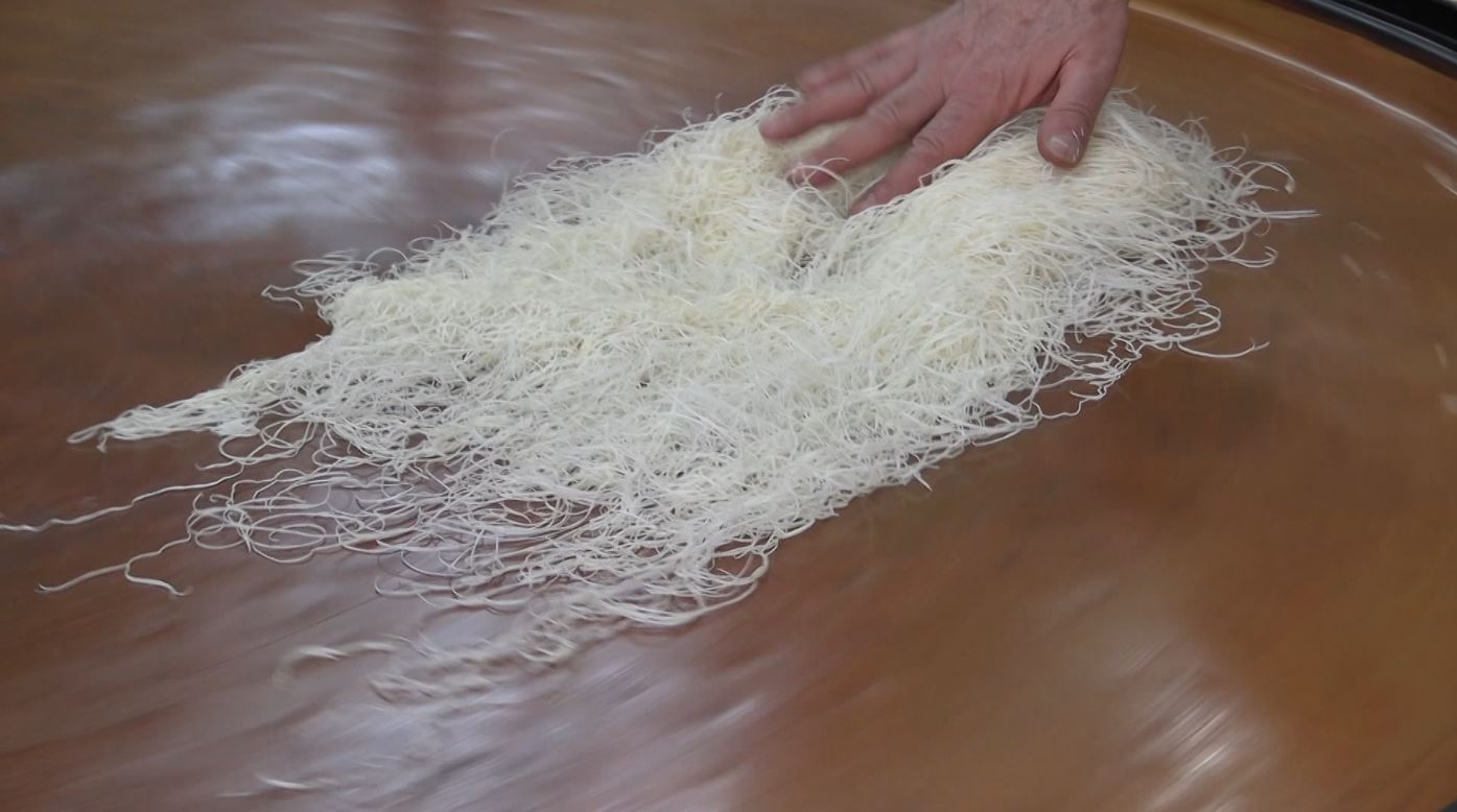 İçerisinde katkı maddesi bulunmayan tel kadayıf, sadece un ve su ile yapılan karışımın, 250 derece sıcaklıktaki kızgın tepside pişirilmesiyle hazırlanıyor.
