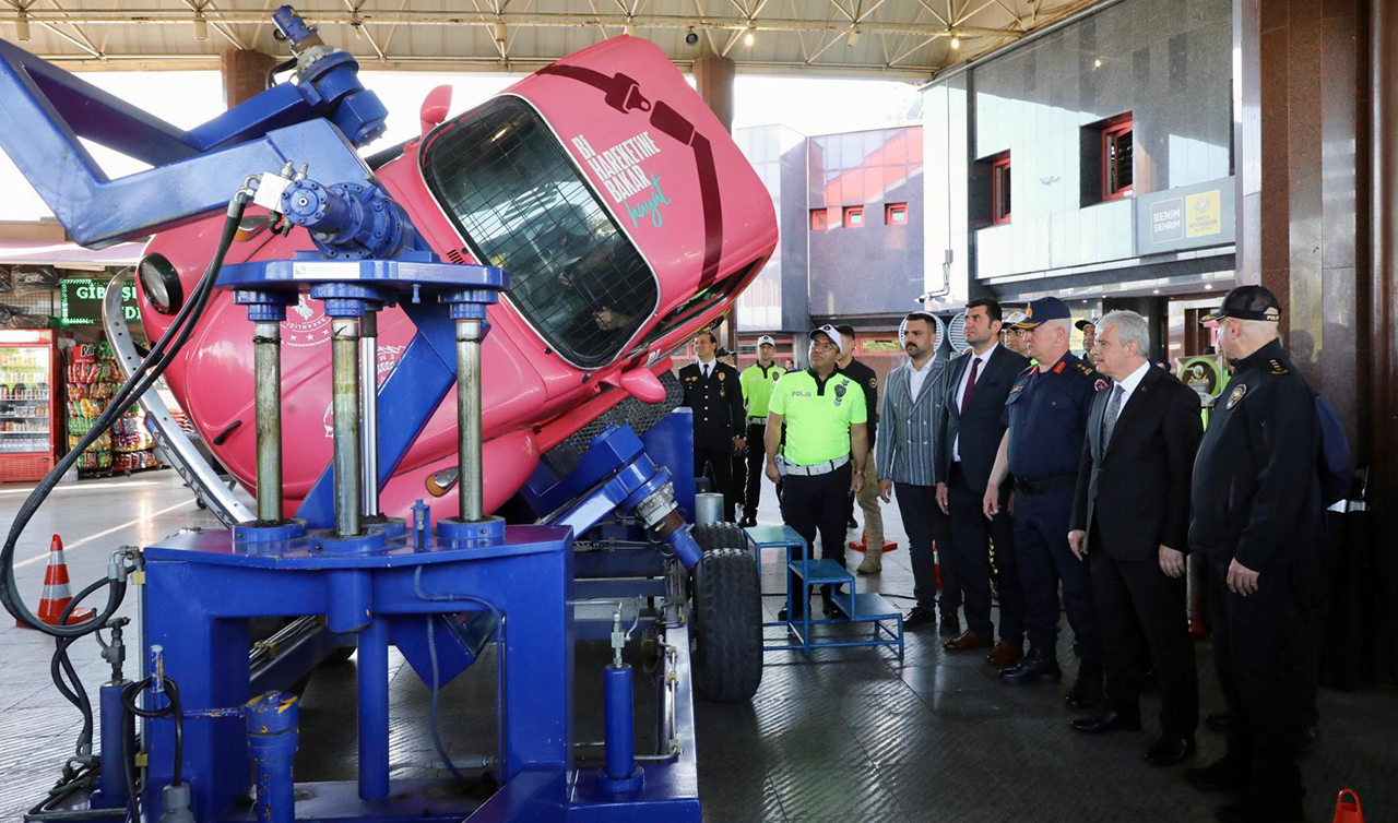 İl Emniyet Müdürlüğü tarafından terminal alanına kurulan emniyet kemeri simülasyon aracı ile hem seyahat edecek yolculara hem de otobüs kaptanlarına emniyet kemerinin önemi uygulamalı olarak gösterildi. (Veli Şengül)