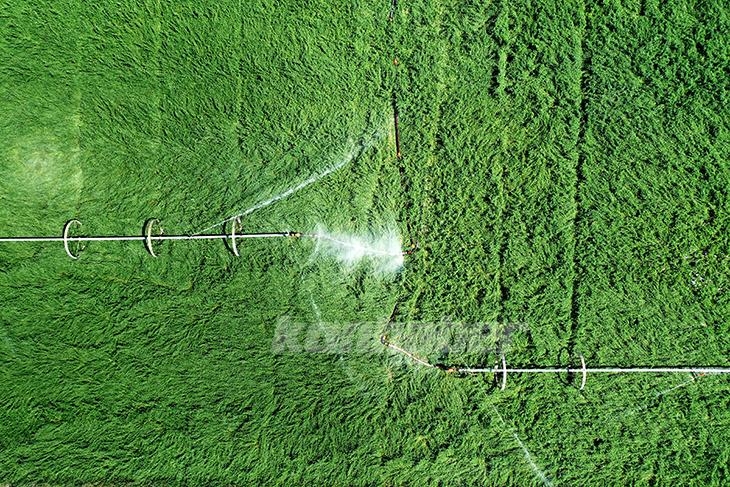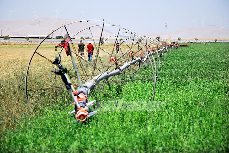 Yağmurlama sulama yönteminde, sulanan yerden malzemenin kuru bölgeye taşınmasının zorluğuna işaret eden Kuşçuoğlu, şunları kaydetti: "Yağmurlamada 4-5 kişi olması lazım. Yonca tarlasında çamur içinde yürümek de zor olduğu için uzun sürüyordu. Bu sistemde kendi başıma geceli gündüzlü 4 günde sulamayı bitiriyorum. Mahsul de fazla susamıyor. Belirli aralıklarla büyük tekerlerin olduğu, 360 metre uzunluğundaki hat üzerinde 50 fıskiye var. Bu hattı, ortadaki benzinli motor ileri geri hareket ettiriyor."