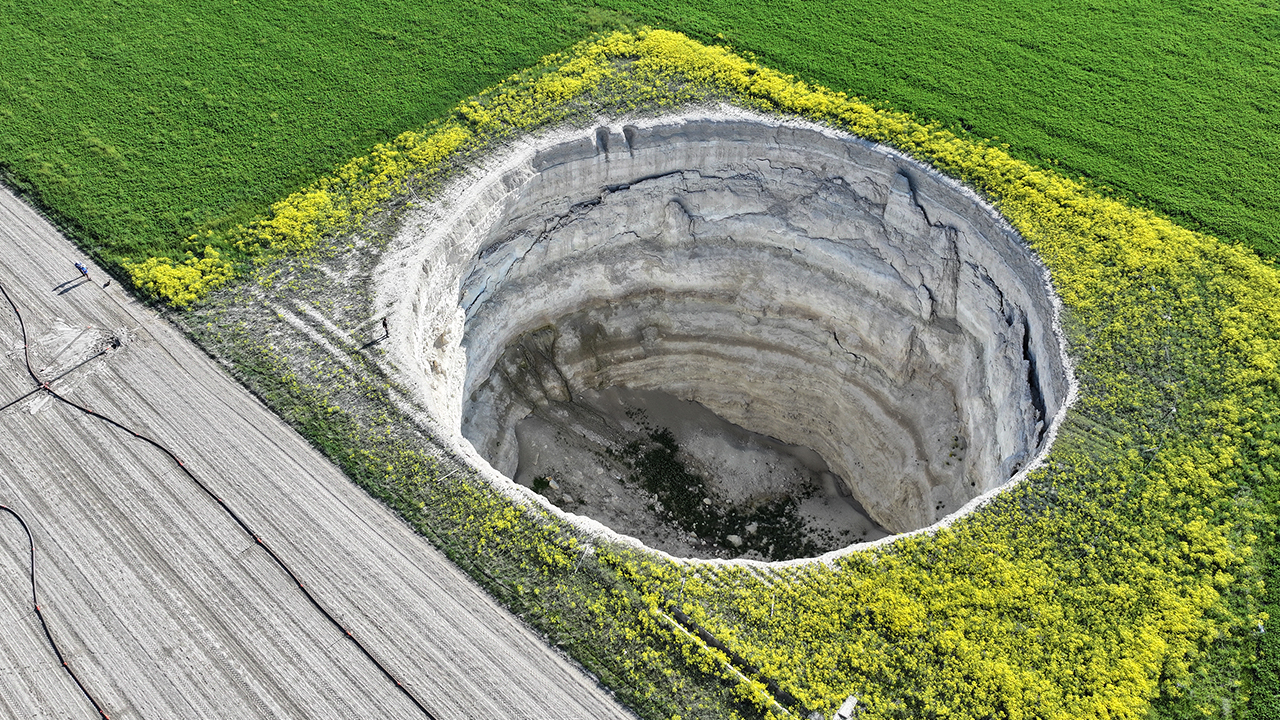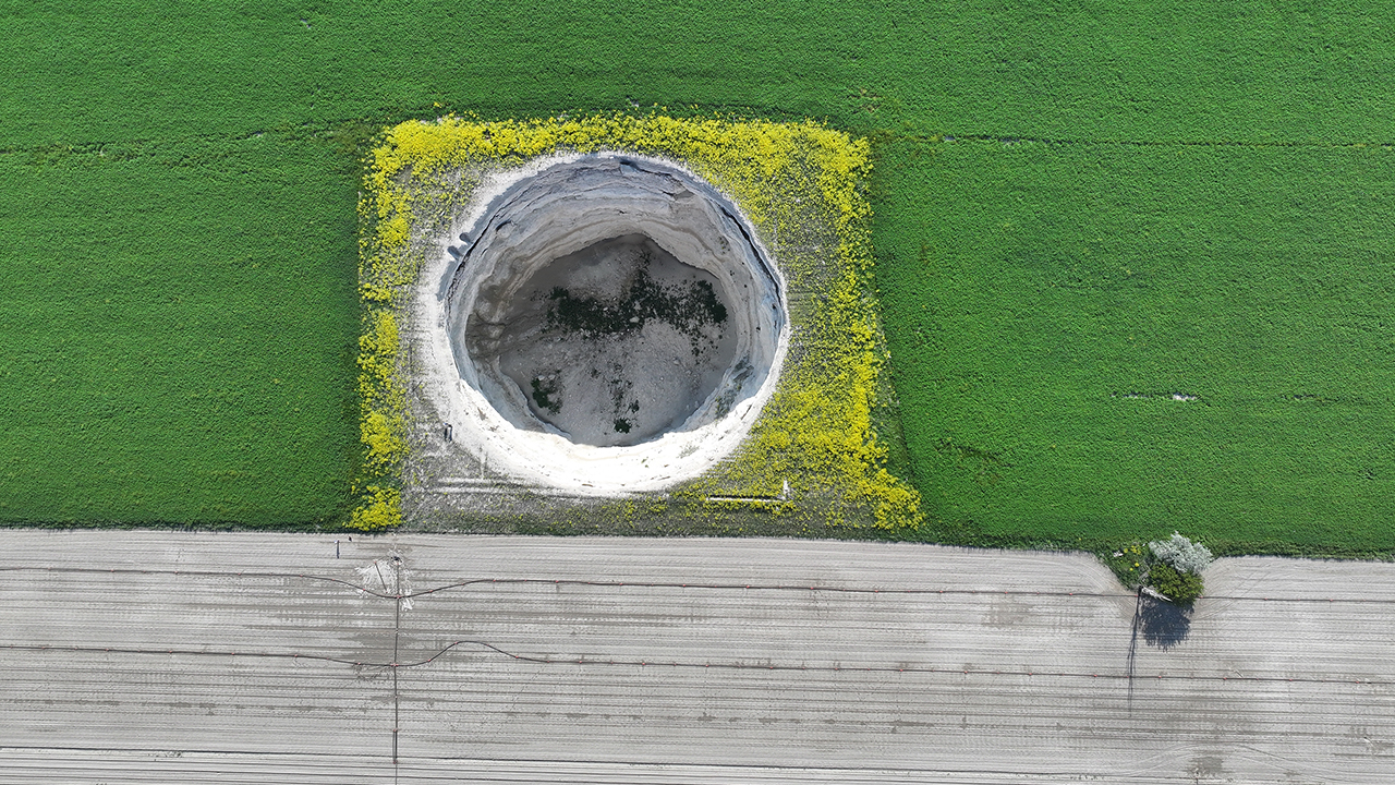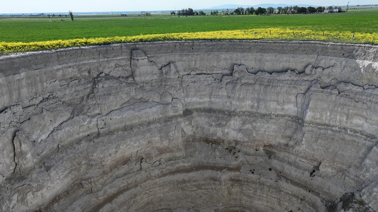 Yoğun sulama faaliyetinin yapıldığı tarlaların arasında oluşan devasa çukur, her geçen yıl genişleyerek büyüyor.
