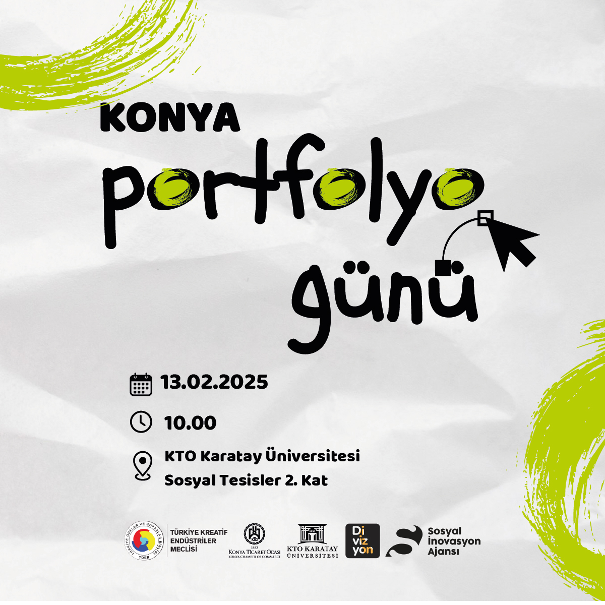 Konya Ticaret Odası (KTO) Karatay Üniversitesi, Türkiye Odalar ve Borsalar Birliği Kreatif Endüstriler Meclisi, Divizyon Açık İnovasyon Platformu, Sosyal İnovasyon Ajansı iş birliğiyle gerçekleştirilecek etkinlikte genç tasarımcı, sanatçı ve iletişimciler sektör profesyonelleriyle bir araya geliyor. 13 Şubat 2025’te KTO Karatay Üniversitesi ev sahipliğinde gerçekleşecek olan “Konya Portfolyo Günleri” katılımcılarına networking, geri bildirim ve kariyer fırsatlarıyla dopdolu bir etkinlik sunuyor.