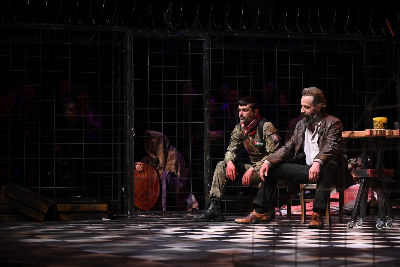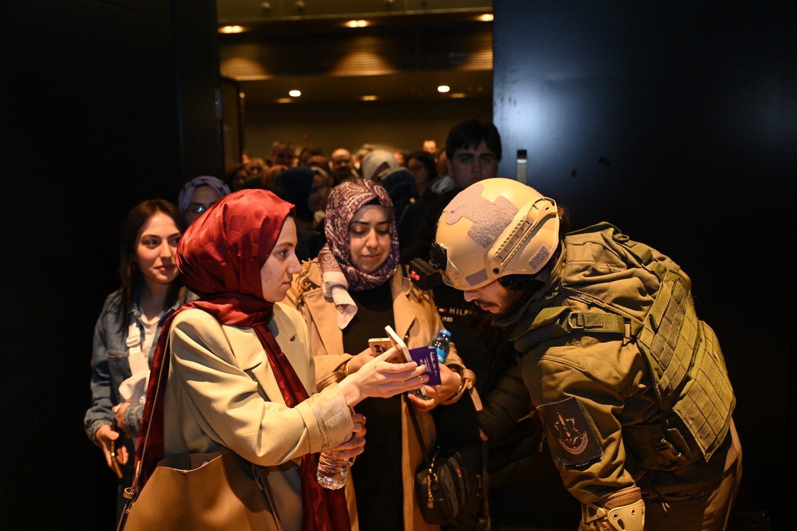 Selçuklu Kongre Merkezi’nde sahnelenen oyun öncesi fuaye alanında İsrail’in Filistinlilere uyguladığı baskının bir nebze de olsa hissedilmesi adına tiyatroseverler, temsili İsrail askeri üniforması giyen görevliler tarafından karşılanarak, yapılan bilet kontrolleri sonrası salona alındı.