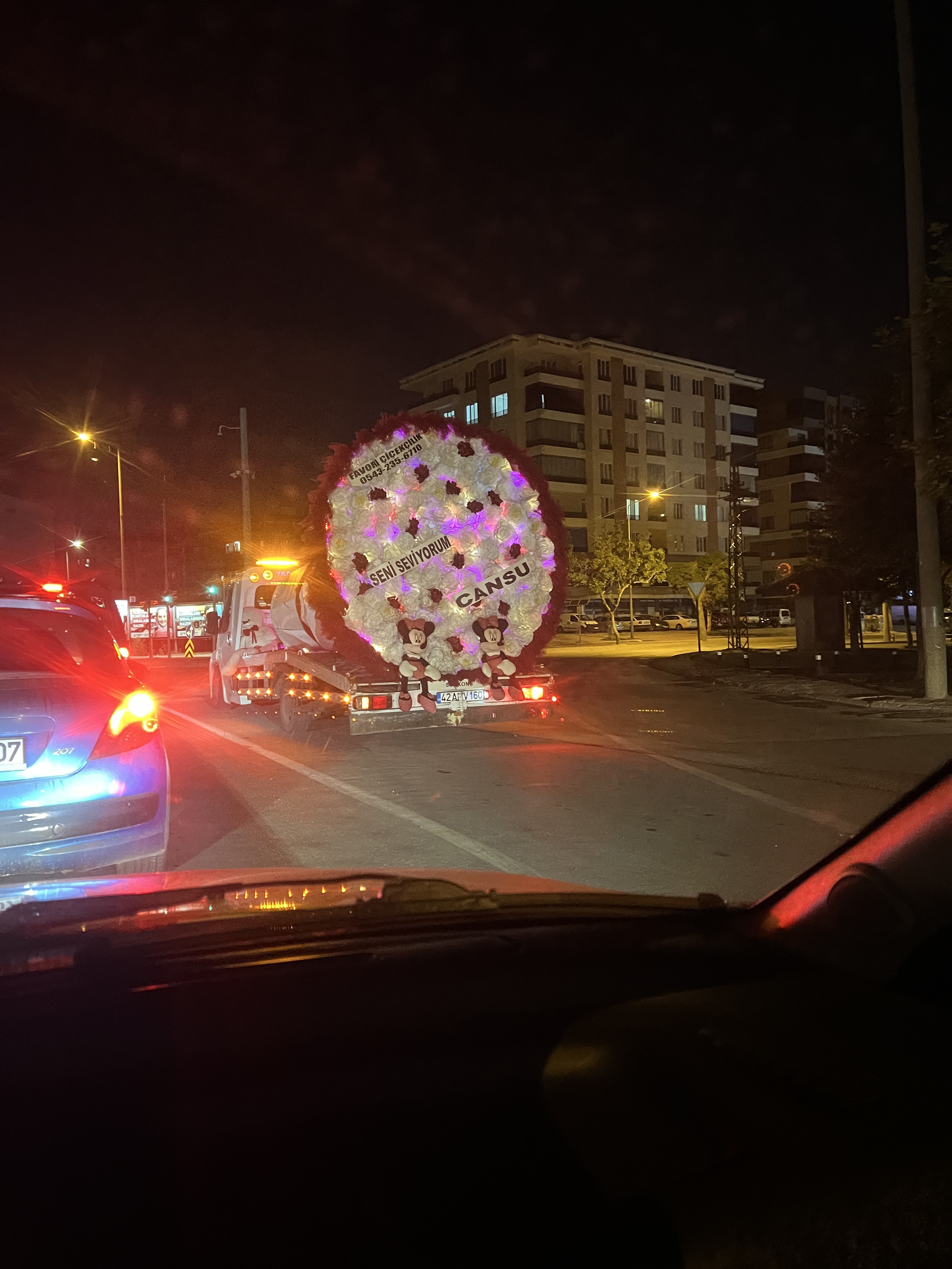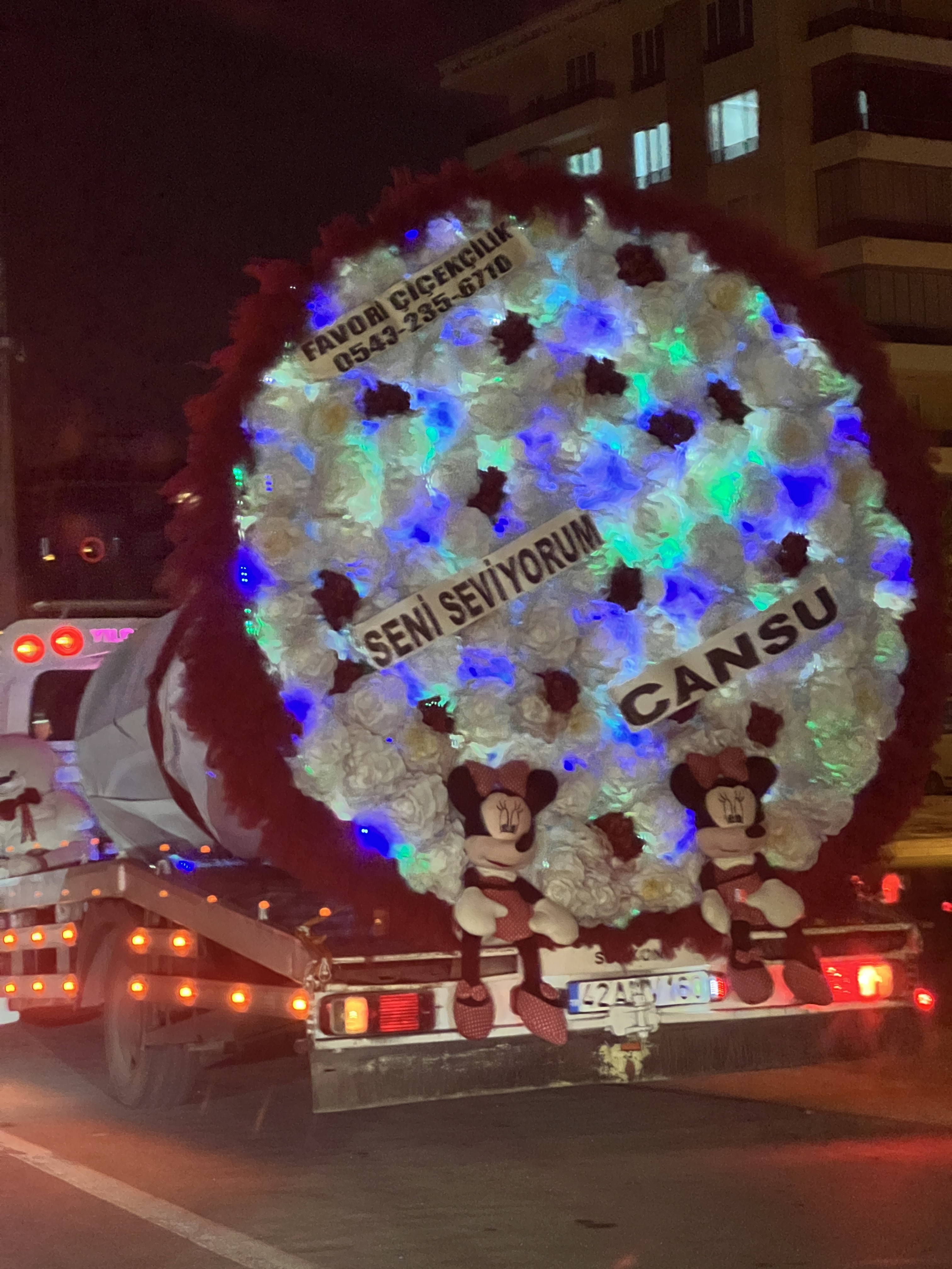 Cep telefonu kamerasına yansıyan görüntülerde, çekicinin araç taşıdığı bölüme ışıklarla donatılmış yapay çiçek buketinin iple bağlandığı görüldü. Bir süre trafikte seyreden çekici gözlerden kayboldu.