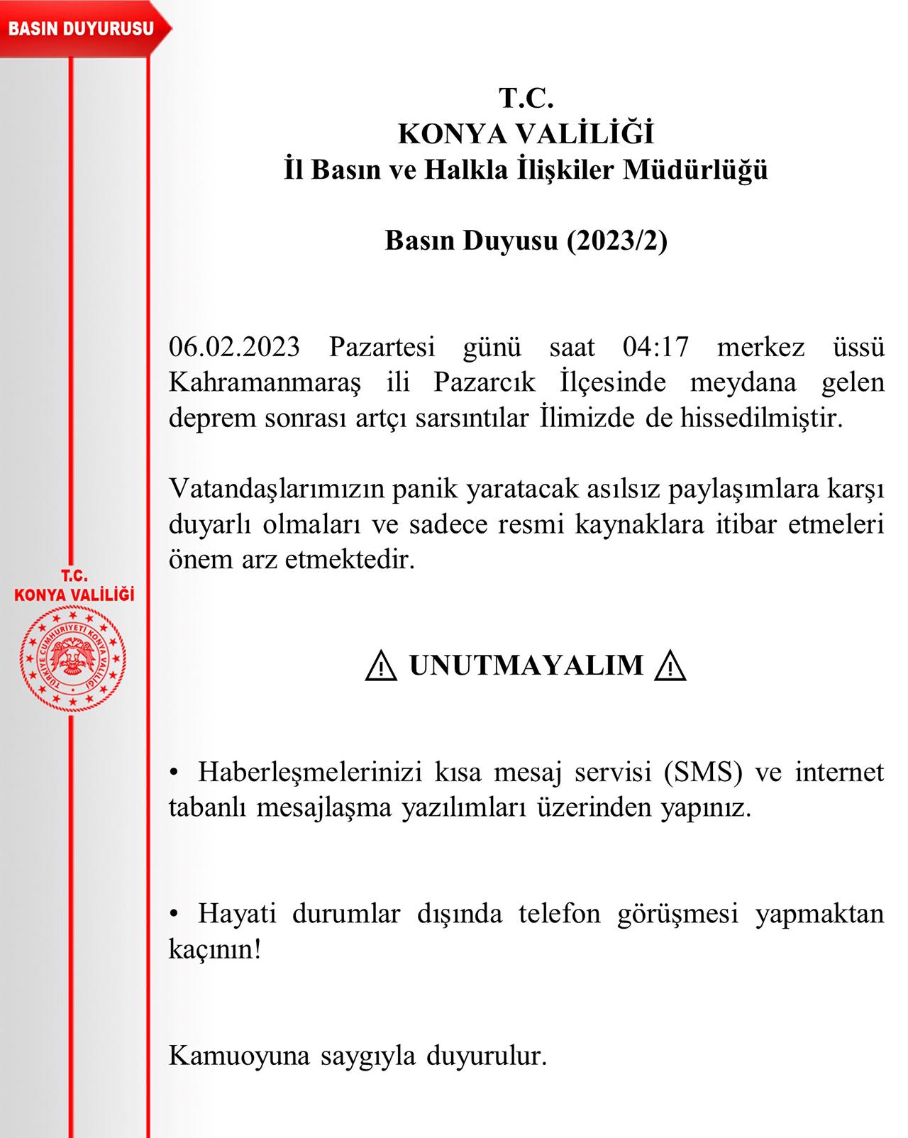 Konya Valiliğinden yapılan açıklamada: “Kahramanmaraş'ın Pazarcık ilçesinde meydana gelen deprem sonrası artçı sarsıntılar ilimizde de hissedilmiştir. Vatandaşlarımızın panik yaratacak asılsız paylaşımlara karşı duyarlı olmaları ve sadece resmi kaynaklara itibar etmeleri önemle arz etmektedir” denildi.