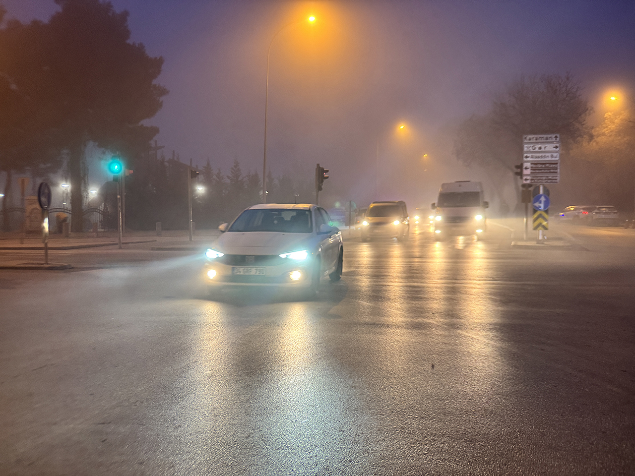 Konya kent merkezinde gece yarısından itibaren görülen yoğun sis, sabah da etkisini sürdürdü. Yoğun sis, şehir merkezi ve çevre yollarda trafik akışını etkiledi. Sürücüler, araçlarıyla takip mesafesini koruyarak ilerlemeye çalıştı.
