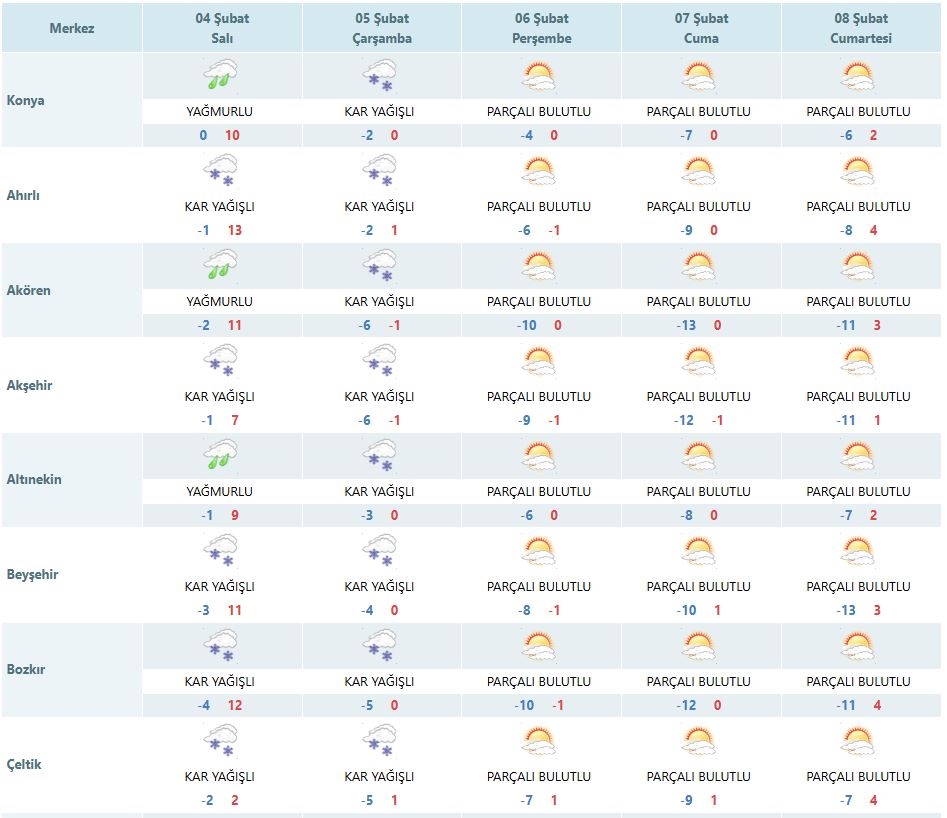 Meteoroloji'den alınan güncel verilere göre, Konya'nın merkez dahil 31 ilçesinde 4 Şubat Salı ve 5 Şubat Çarşamba günü yağmur ve kar yağışının etkili olması beklenirken, vatandaşların dikkatli ve tedbirli olması önem arz ediyor.