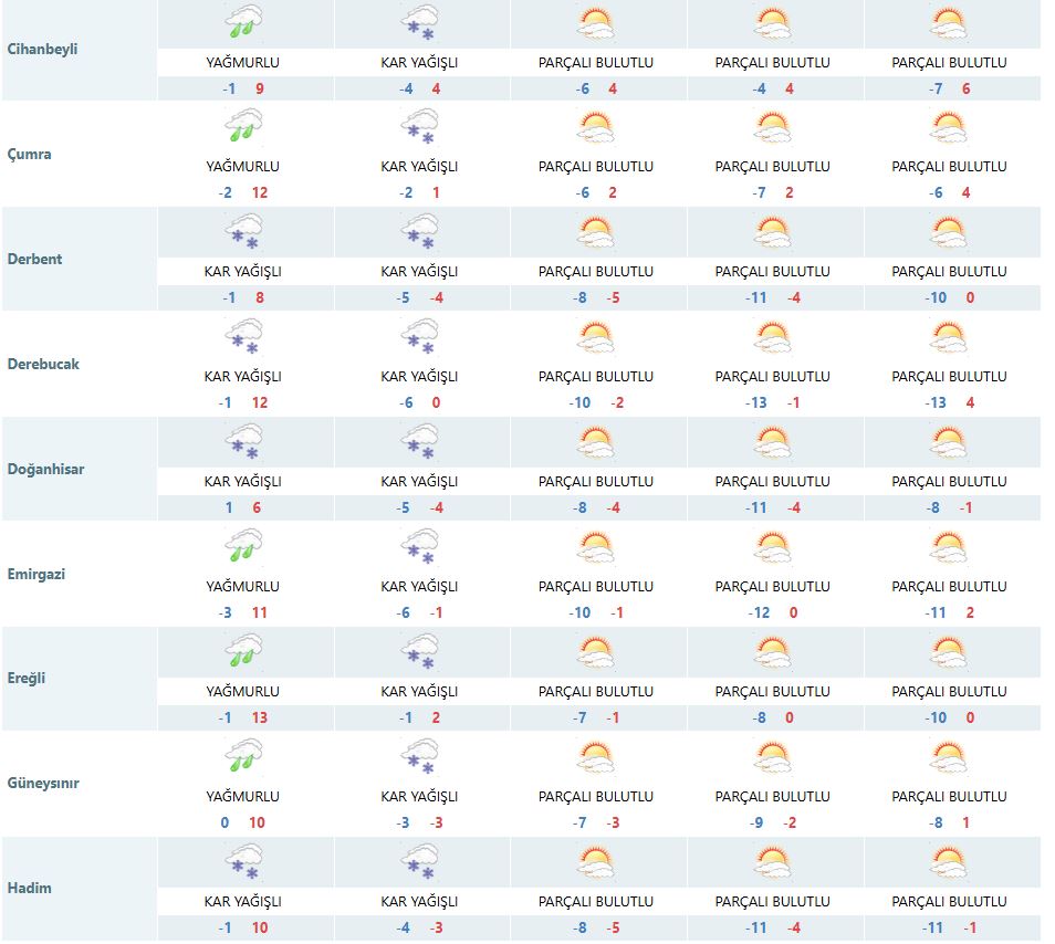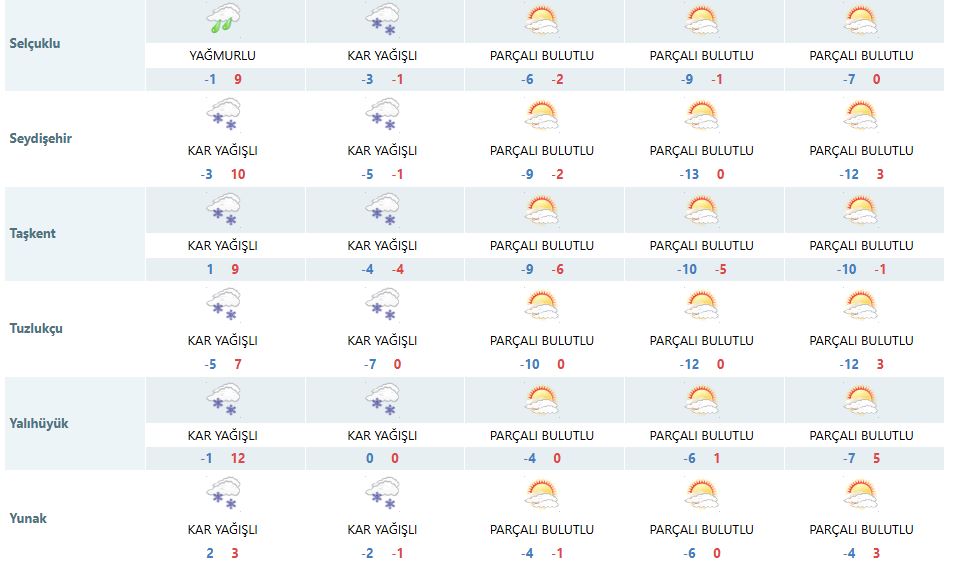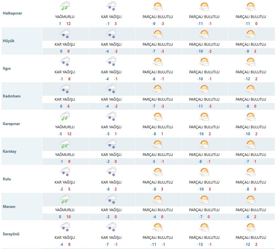 Meteoroloji Genel Müdürlüğü Konya ve 31 ilçesi için güncel hava tahmin raporlarını yayımladı. Konya ve 31 ilçesinde yeni haftada kar yağışı beklenirken sıcaklıklar düşecek. İşte Meteoroloji'nin tahminine göre Konya'da kar yağışının beklendiği günler...