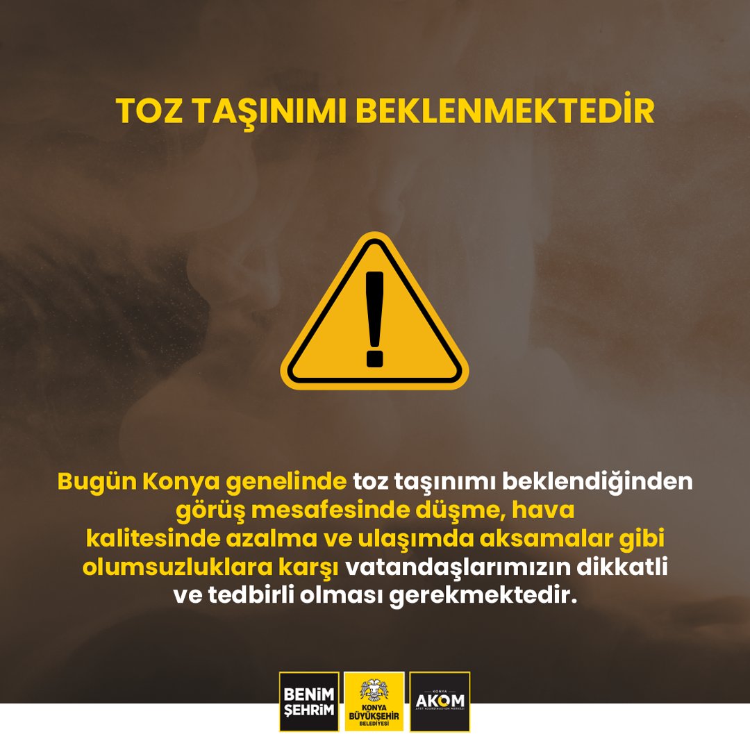 Konya’da bugün toz taşınımı bekleniyor. Konyalılara toz taşınımı uyarında bulunan AKOM tarafından yapılan açıklama, “Bugün Konya genelinde toz taşınımı beklendiğinden, görüş mesafesinde düşme, hava kalitesinde azalma ve ulaşımda aksamalar gibi olumsuzluklara karşı vatandaşlarımızın dikkatli ve tedbirli olması gerekmektedir” denildi. (Yunus Köroğlu)