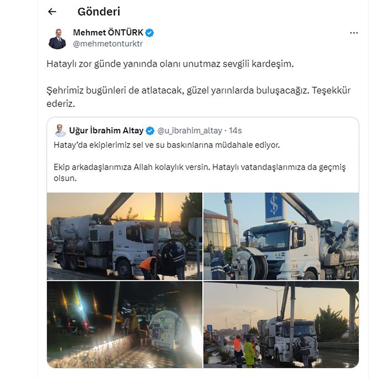 Sosyal medya hesabından paylaşım yapan Hatay Büyükşehir Belediye Başkanı Mehmet Öntürk “Hataylı zor günde yanında olanı unutmaz sevgili kardeşim. Şehrimiz bugünleri de atlatacak, güzel yarınlarda buluşacağız. Teşekkür ederiz. (Veli Şengül)
