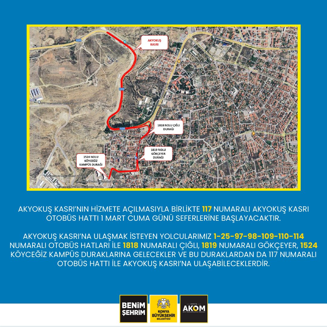 Konya'da Akyokuş Kasrı'nın hizmete açılmasıyla birlikte 117 numaralı Akyokuş Kasrı Otobüs Hattı 1 Mart Cuma günü seferlerine başlayacak.