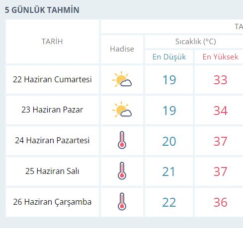 Bayram tatilinin ardından aşırı sıcakların etkisini hissedecek olan Konya'da, 24 Haziran Pazartesi günü sıcaklık 37 , 25 Haziran Salı günü 37 ve 26 Haziran Çarşamba günü 36 derece olması öngörülüyor.