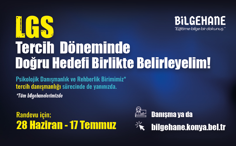 Tercih danışmanlığı, Bilgehanelerden alınacak randevu sistemiyle 17 Temmuz tarihine kadar devam edecek. Vatandaşlar Bilgehane danışmaları veya “bilgehane.konya.bel.tr” adresinden alınacak randevularla birlikte danışmanlık hizmetinden ücretsiz yararlanabilecek.