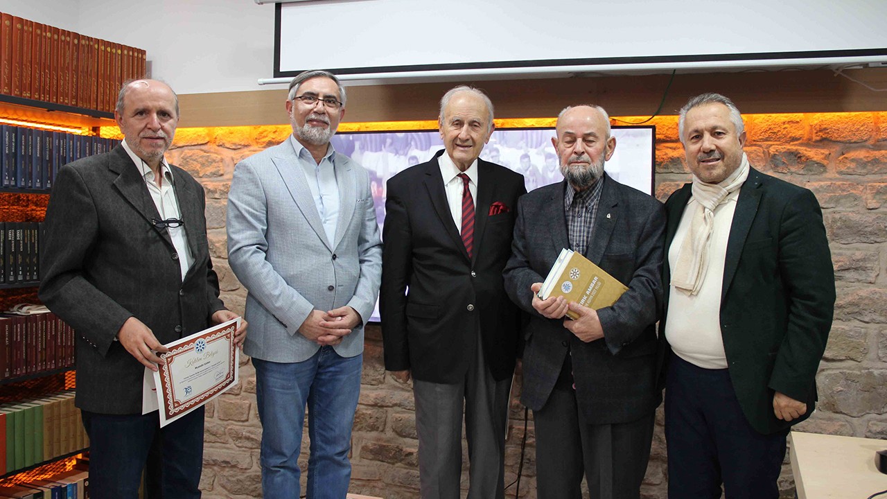 Türkiye Yazarlar Birliği Konya Şubesi Başkanı Ahmet Köseoğlu, Prof. Dr. Saim Sakaoğlu ve Postnişin Fahri Özçakıl tarafından Nail Bülbül’e İhtiram Beratı, düzenleyici olan Mustafa Güden’e Teşekkür Beratı takdim edildi. (Yunus Köroğlu)