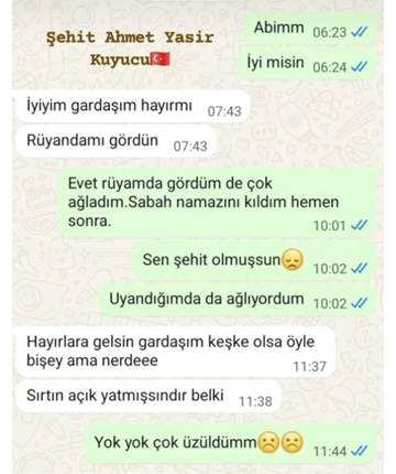 Düşen kargo uçağında şehit olan askerlerimiz son yolculuğuna uğurlanırken şehit Ahmet Yasir Kuyucu'nun saatler önce kız kardeşiyle yaptığı konuşma ortaya çıktı. Kız kardeşinin yazdığı mesajda, "Sen şehit olmuşsun" yazdığı görüldü.