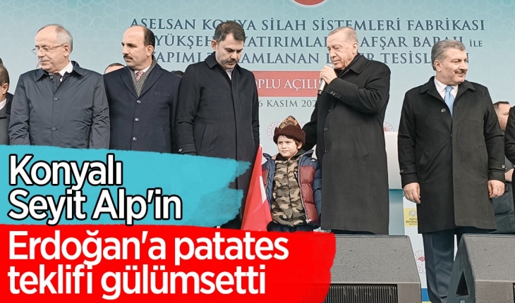 Cumhurbaşkanı Recep Tayyip Erdoğan, Konya'da Toplu Açılış Töreni’nde kalabalık içerisinde börklü küçük Seyit Alp’i fark edip sahneye yanına aldı. Küçük Seyit Alp Erdoğan’ı eve patates yemeye davet etti. O anlar Erdoğan’ı gülümsetirken, minik çocuğun yanağından makas alarak "İşimiz çok" dedi.