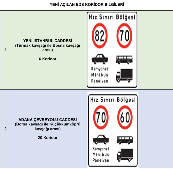 Proje kapsamında Yeni İstanbul Caddesi’nde (Türmak Kavşağı ile Bosna Kavşağı arası) 6 ayrı hız koridoru, Adana Çevreyolu Caddesi’nde (Borsa Kavşağı ile Küçükkumköprü Kavşağı arası) ise 20 hız koridoru oluşturularak denetim ağı genişletildi.ORTALAMA HIZ DENETİMİ BAŞLADI