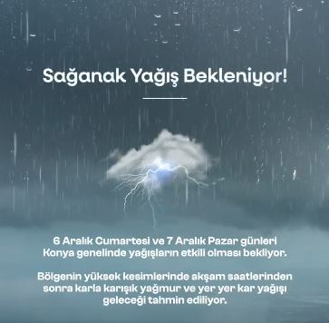AKOM tarafından yapılan bilgilendirmede şu ifadelere yer verildi:“Konya genelinde 6-7 Aralık tarihlerinde sağanak yağışların etkili olması öngörülmektedir. Özellikle yüksek kesimlerde akşam saatlerinden sonra karla karışık yağmur ve yer yer kar yağışı beklenmektedir. Vatandaşlarımızın meteorolojik koşullara karşı dikkatli ve tedbirli olmaları önemle rica olunur.”