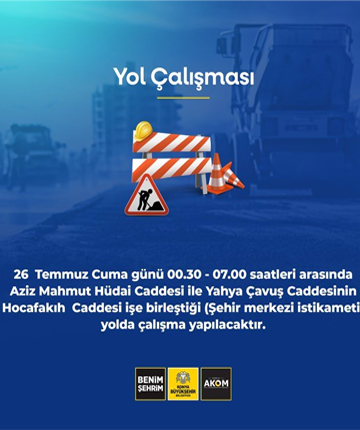 "Yol Çalışması Hakkında Bilgilendirme 26 Temmuz Cuma 00.30 - 07.00 Aziz Mahmut Hüdai Caddesi ile Yahya Çavuş Caddesinin Hocafakıh Caddesi ile birleştiği (Şehir merkezi istikameti) yolda çalışma yapılacaktır. Çalışmalar esnasında yol araç trafiğine kapatılacak, trafik alternatif güzergahlardan sağlanacaktır." (Veli Şengül)