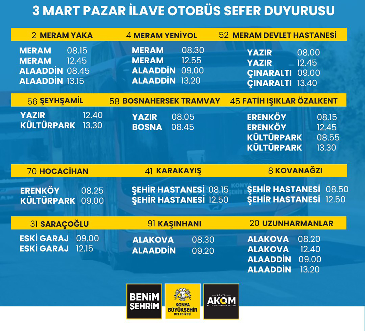 Konuyla ilgili açıklama Konya AKOM’dan (Afet Koordinasyon Merkezi) geldi. AKOM’dan yapılan açıklamada şu ifadelere yer verildi: “3 Mart Pazar günü yapılacak olan Milli Savunma Üniversitesi Askeri Öğrenci Aday Belirleme Sınavı nedeniyle bazı otobüs seferlerimizde değişiklik yapılmıştır.” Sefer saatlerimizde yapılan değişiklikler ise şu şekilde;