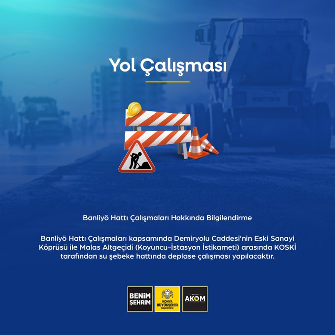 AKOM sosyal medya hesabından şu ifadeleri kullandı:" 20 - 27 Mayıs tarihleri arasında Banliyö Hattı Çalışmaları kapsamında KOSKİ tarafından su şebeke hattında deplase çalışması yapılacaktır.