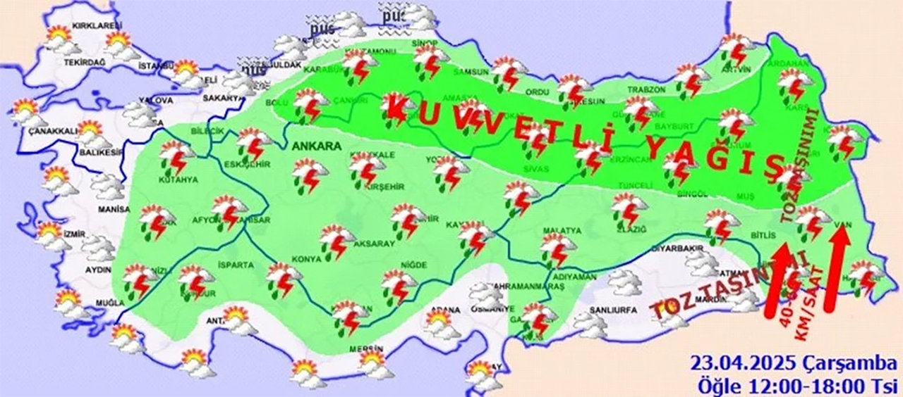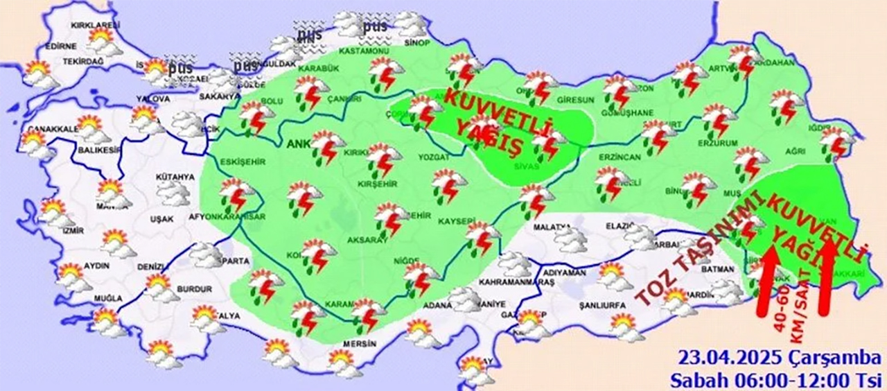 Meteorolojinin son tahminlerine göre bugün (23 Nisan Çarşamba) Konya'da sağanak ve gök gürültülü sağanak yağış etkili olacak.