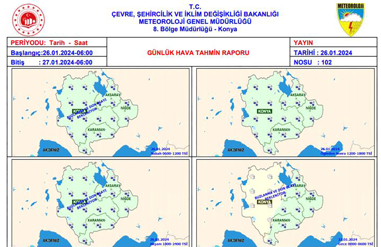 Meteorolojiden alınan bilgiye göre Konya’da havanın bugün en yüksek 4 derece, parçalı ve çok bulutlu olması ve aralıklı kar yağışlı geçeceği tahmin ediliyor. Sabah ve gece saatlerinde yer yer pus ve sis hadisesi ile birlikte buzlanma ve don olayı bekleniyor.