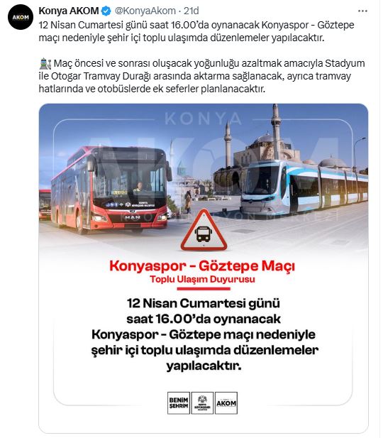 Konuya ilişkin AKOM'un sosyal medya hesabından yapılan paylaşımda şu ifadelere yer verildi:"12 Nisan Cumartesi günü saat 16.00'da oynanacak Konyaspor - Göztepe maçı nedeniyle şehir içi toplu ulaşımda düzenlemeler yapılacaktır. Maç öncesi ve sonrası oluşacak yoğunluğu azaltmak amacıyla Stadyum ile Otogar Tramvay Durağı arasında aktarma sağlanacak, ayrıca tramvay hatlarında ve otobüslerde ek seferler planlanacaktır.” (Yunus Köroğlu)