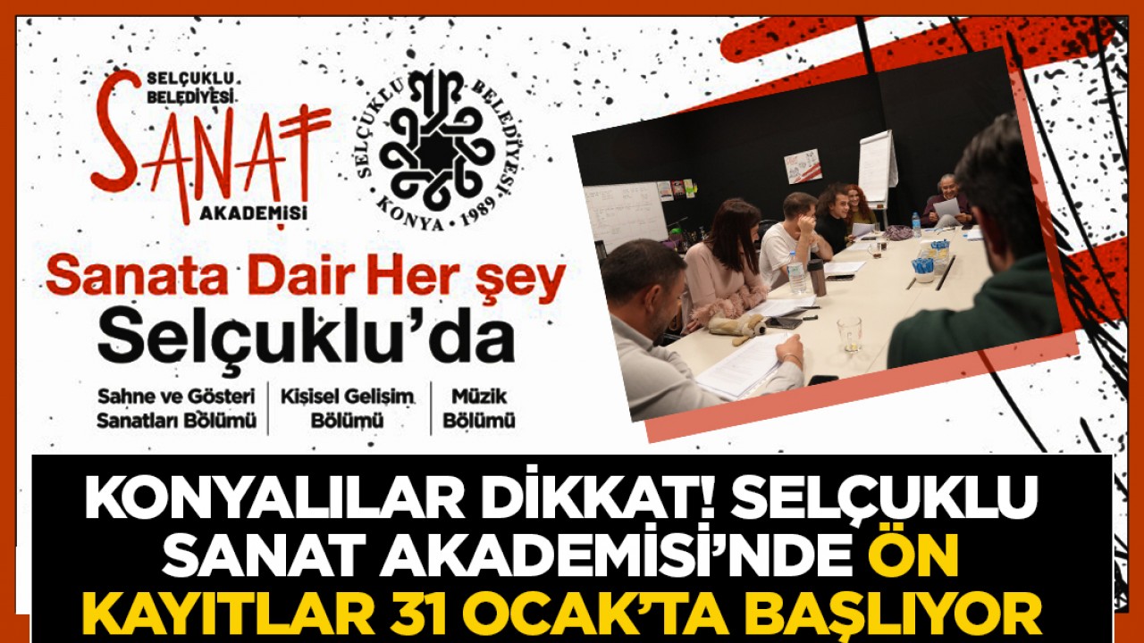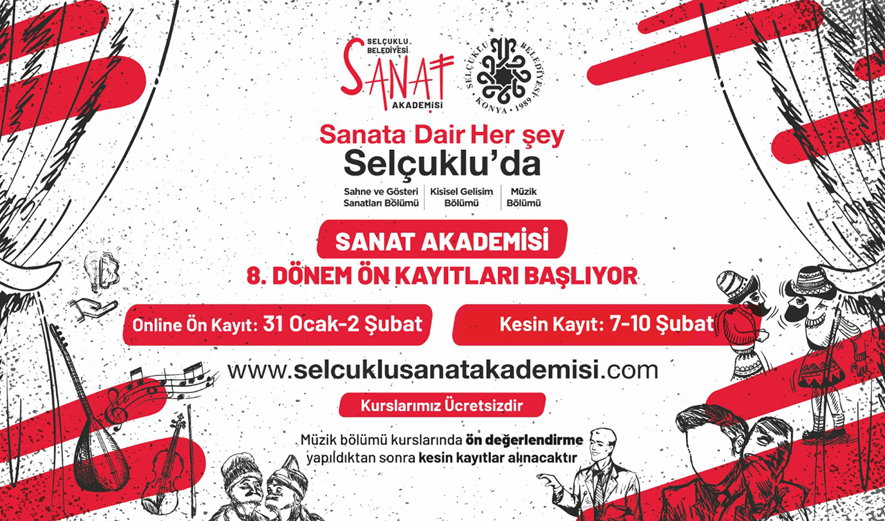 31 Ocak’ta www.selcuklusanatakademisi.com adresinden gerçekleştirilecek ön kayıtlar 2 Şubat’ta sona erecek. Selçuklu Belediyesi Tiyatro Müdürlüğü’nce gerçekleştirilen etkinliklerle yıl boyunca şehrin kültür ve sanat hayatına canlılık katan akademide eğitimler ücretsiz olarak verilecek.