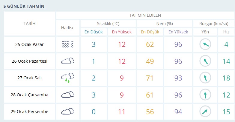 Konya için yeni haftada 25 Ocak Pazartesi günü çok bulutlu hava hakim, sıcaklık ise 12 derece, 27 Ocak Salı günü ise yağmur beklenirken sıcaklık 9 derece, 28 Ocak Çarşamba günü çok bulutlu en yüksek sıcaklık 9 derece, 29 Ocak Perşembe günü ise çok bulutlu hava etkisini sürdürürken sıcaklığın en yüksek 11 dereceyi görmesi bekleniyor.