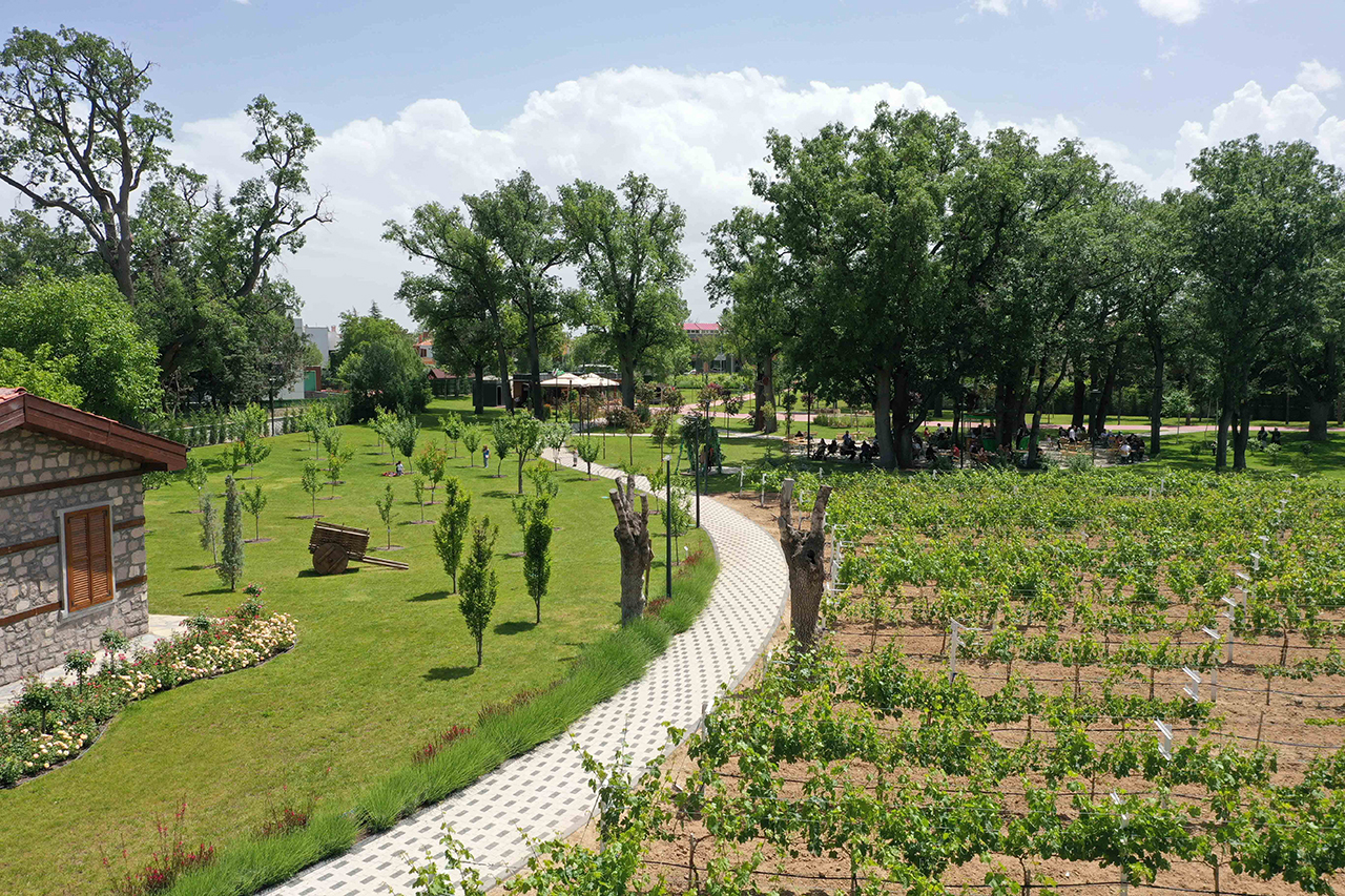 Her biri mevsiminde dalından koparılıp ikram edilen meyveler, geçmişin geleneklerini yaşatan tatlar olarak Meram’ın bağrında yeniden hayat buluyor. Bağ da ayrıca kadim Konya medeniyetinden izler taşıyan bir taş ev de yükseliyor. Bu tarihî yapı, hem nostaljiye hem de estetiğe davetiye çıkarıyor.