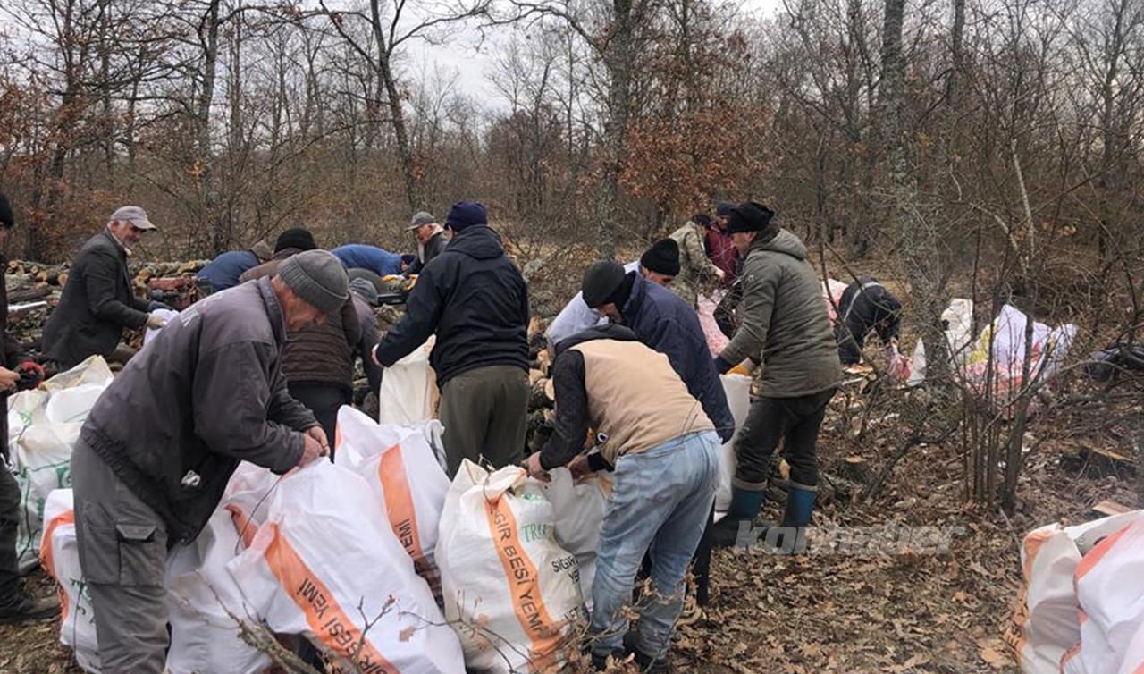 Uygun boylarda kesilen odunlar çuvallara konularak, tırlara yüklendi. Odun yüklü 2 tır, depremden etkilenen kentlere sevk edildi.