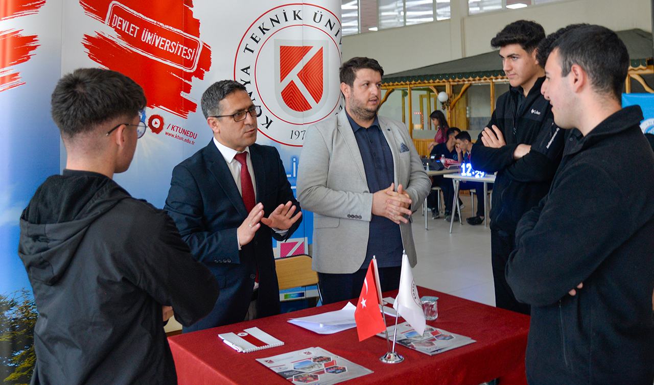 KTÜN Kariyer Merkezi ve Kurumsal İletişim Koordinatörlüğü Tanıtım Ofisi uzmanlarından oluşan ekip tarafından, üniversitenin fakülteleri, bölümleri, laboratuvar olanakları, staj ve iş imkânları gibi birçok konu hakkında öğrencilere detaylı bilgiler sunuldu.