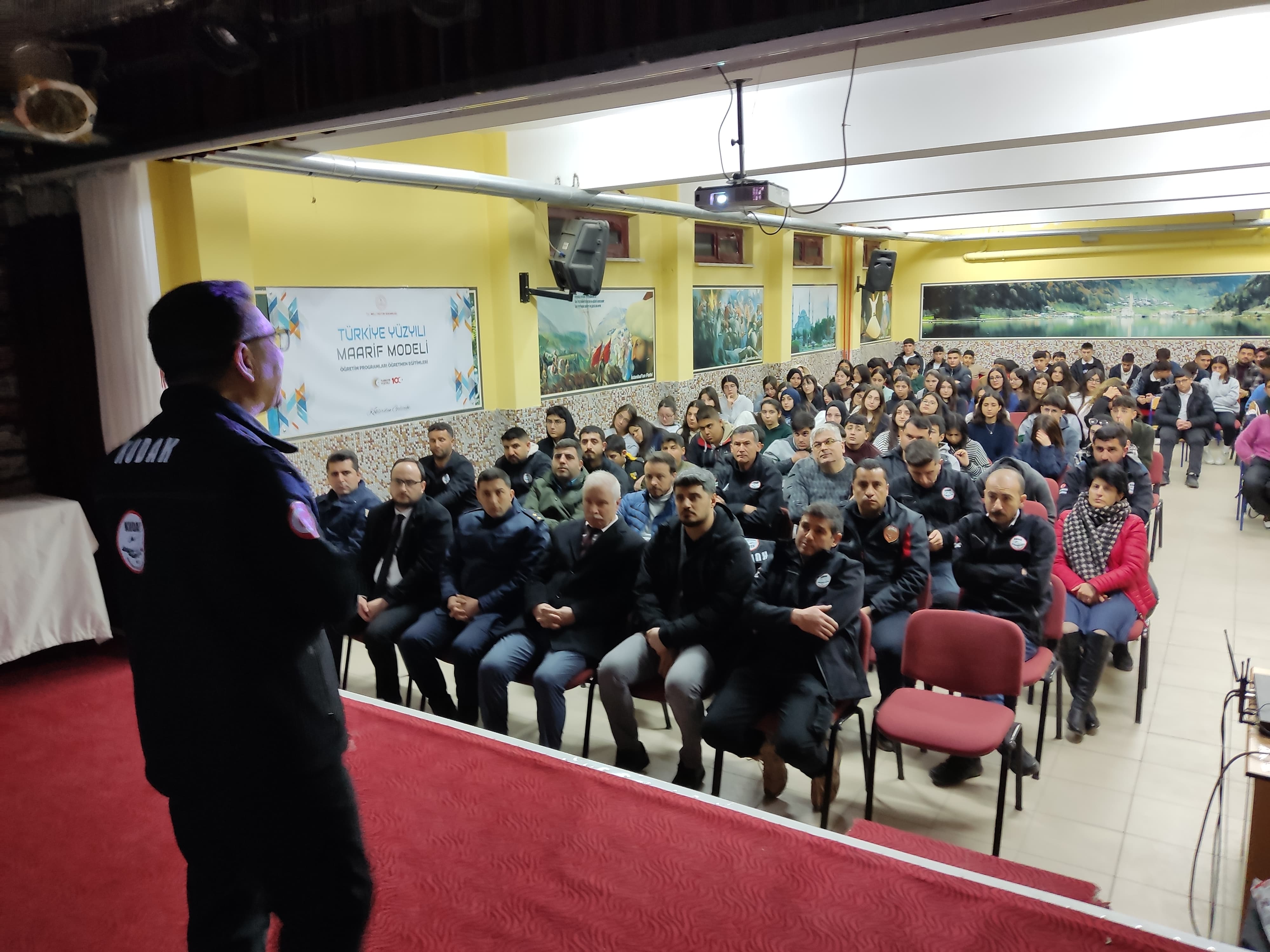 Daha sonra 6 Şubat konulu sinevizyon izletildi. Programda öğrencilere yönelik ayrıca gönüllüler tarafından sinevizyon şeklinde ilk yardım, yangın ile mücadele eğitimi, afet farkındalık bilinci oluşturma konuları ve 6 Şubat Kahramanmaraş merkezli depremde arama kurtarma tecrübeleri ile anılar paylaşıldı.