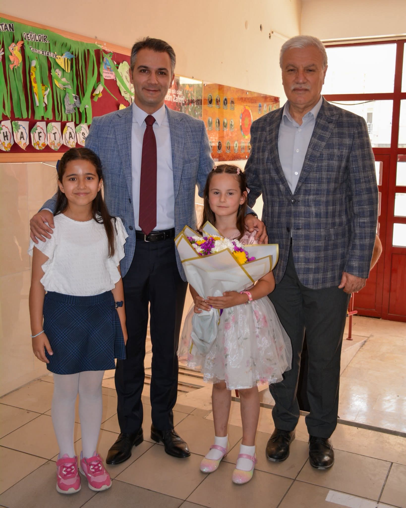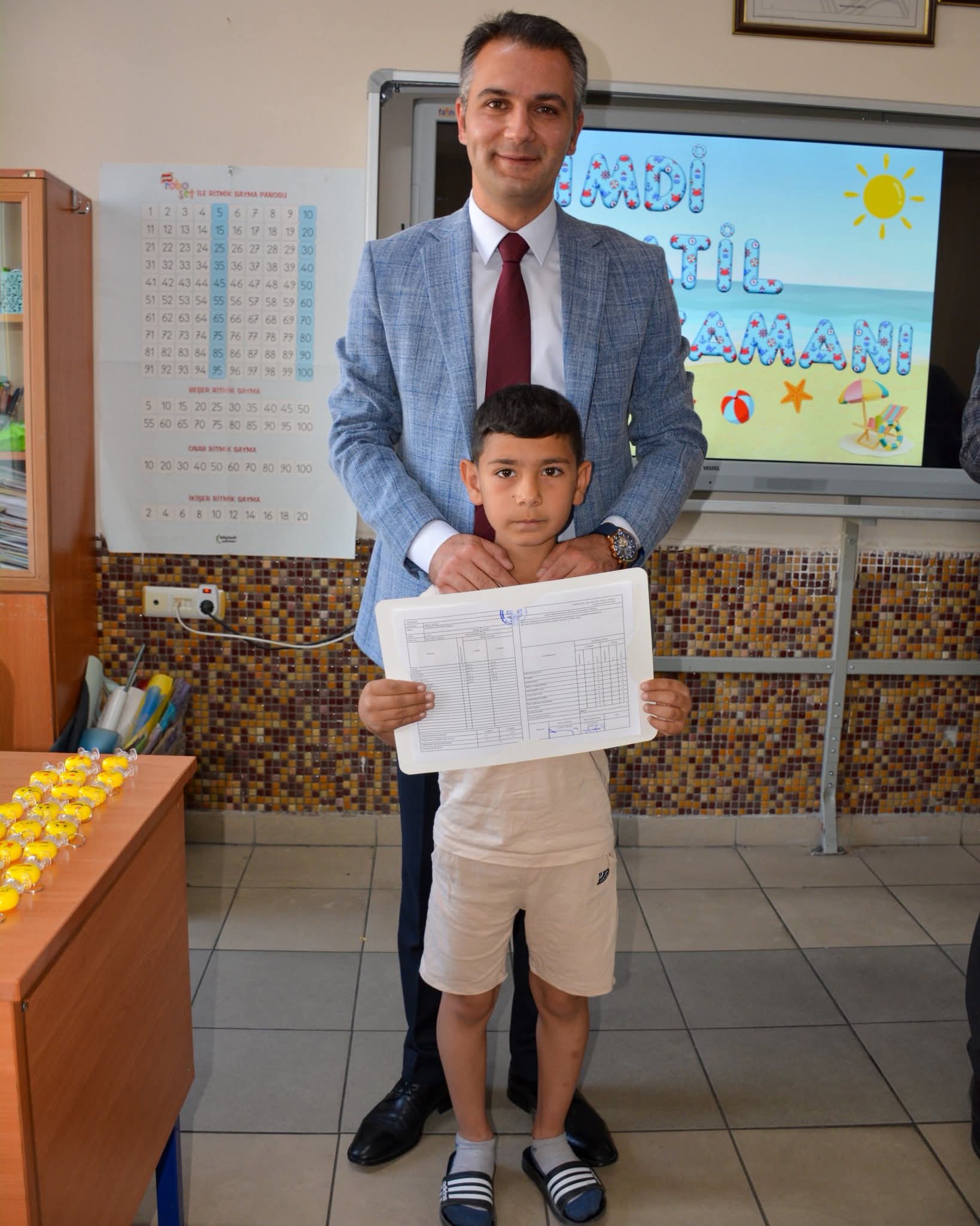Öğrenci ve öğretmenlerle sınıflarında bir araya gelen Kaymakam Canpolat, öğrencileri tebrik ederek iyi tatiller diledi. (Veli Şengül)