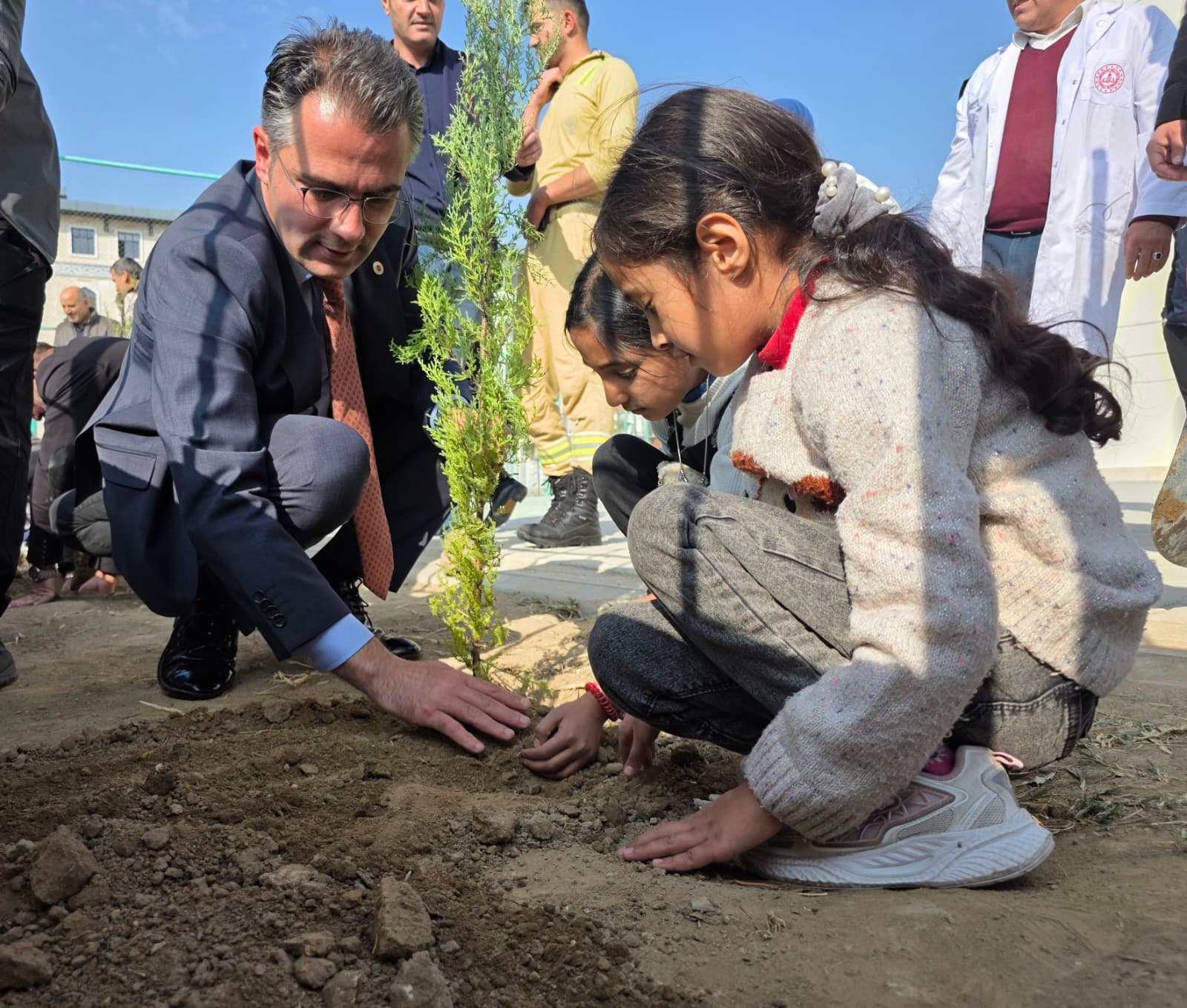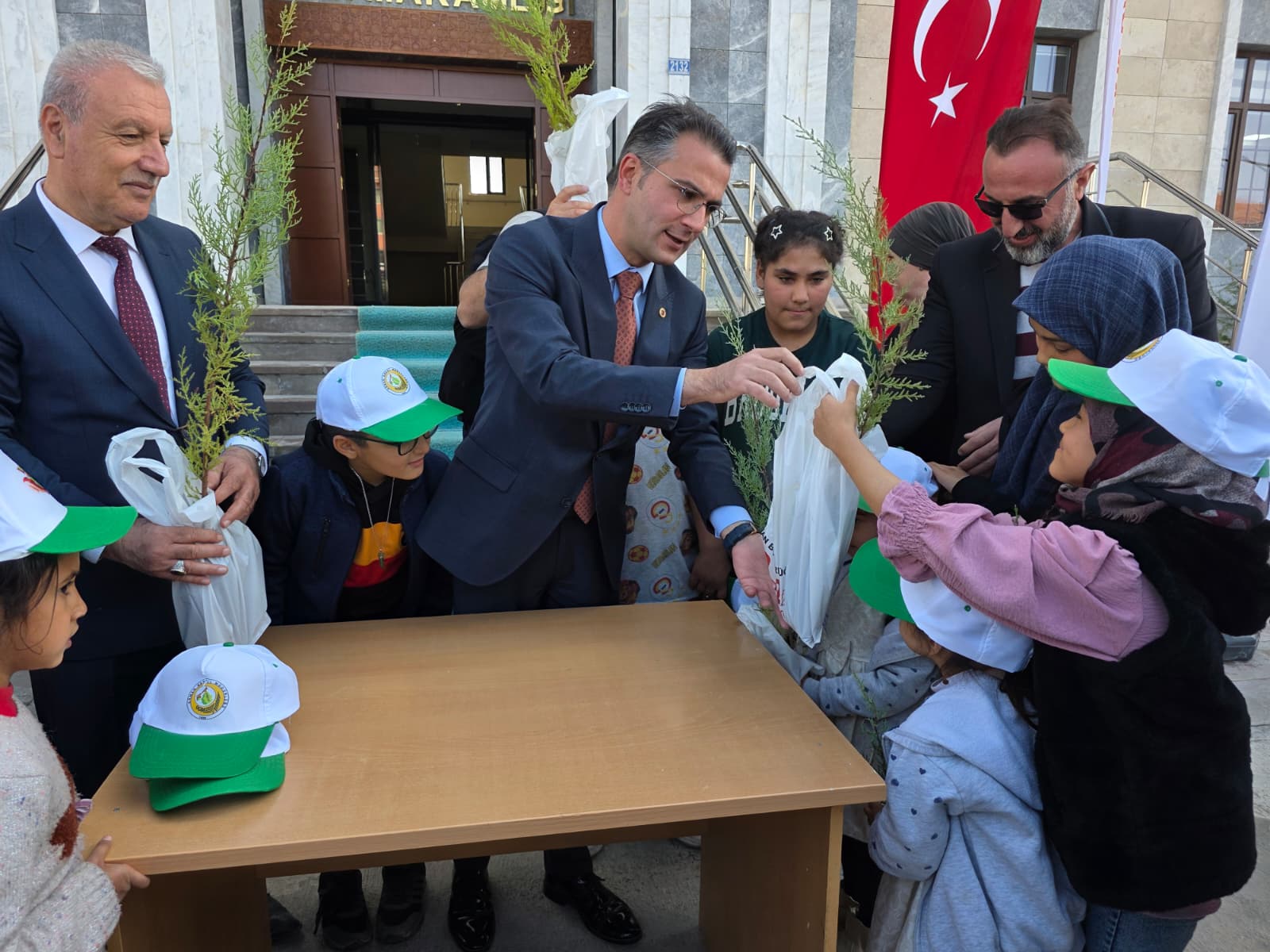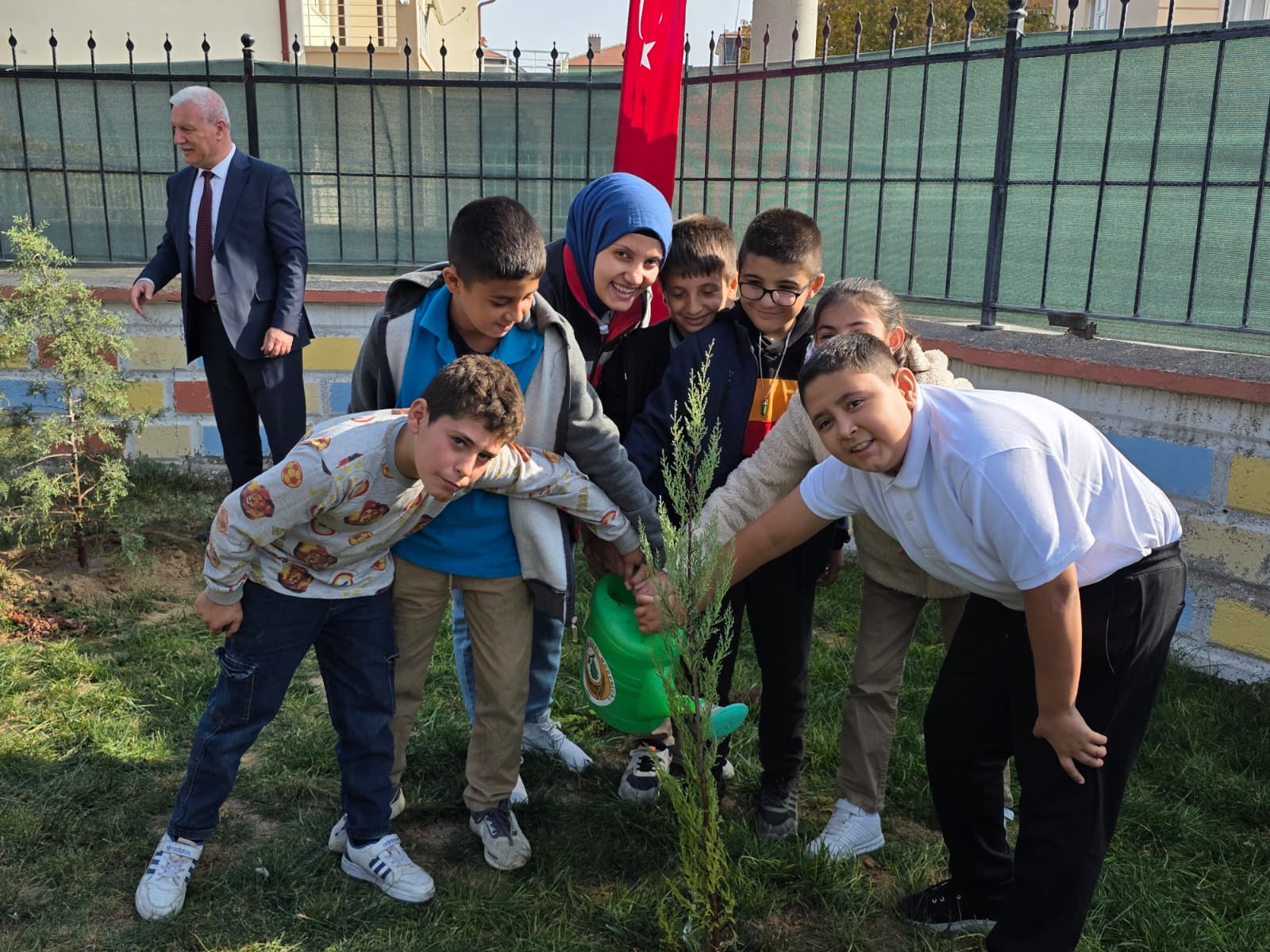 Saat 11:11'de Kaymakam Ömer Faruk Canpolat, Belediye Başkanı AbdurrahimSertdemir, protokol üyeleri ve öğrenciler fidanları toprakla buluşturarak can suyu verdi.