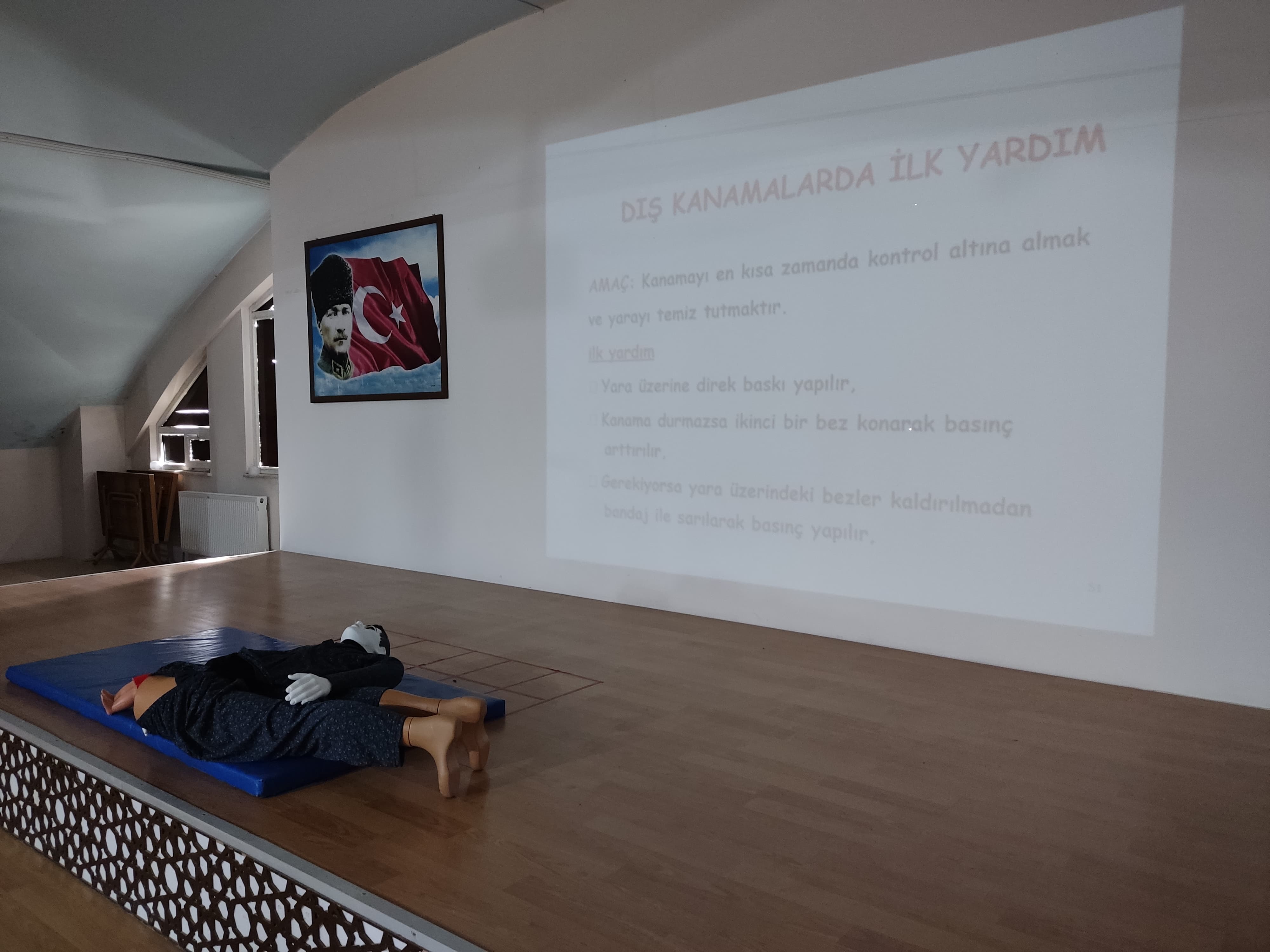 İlçe Milli Eğitim Müdürlüğü konferans salonunda düzenlenen ve Sağlık Personeli Metin Koç tarafından verilen eğitimde, acil durumlarda yapılması gereken temel müdahaleler, kalp masajı, boğulma ve yaralanmalarda ilk yardım uygulamaları teorik ve pratik olarak aktarıldı.