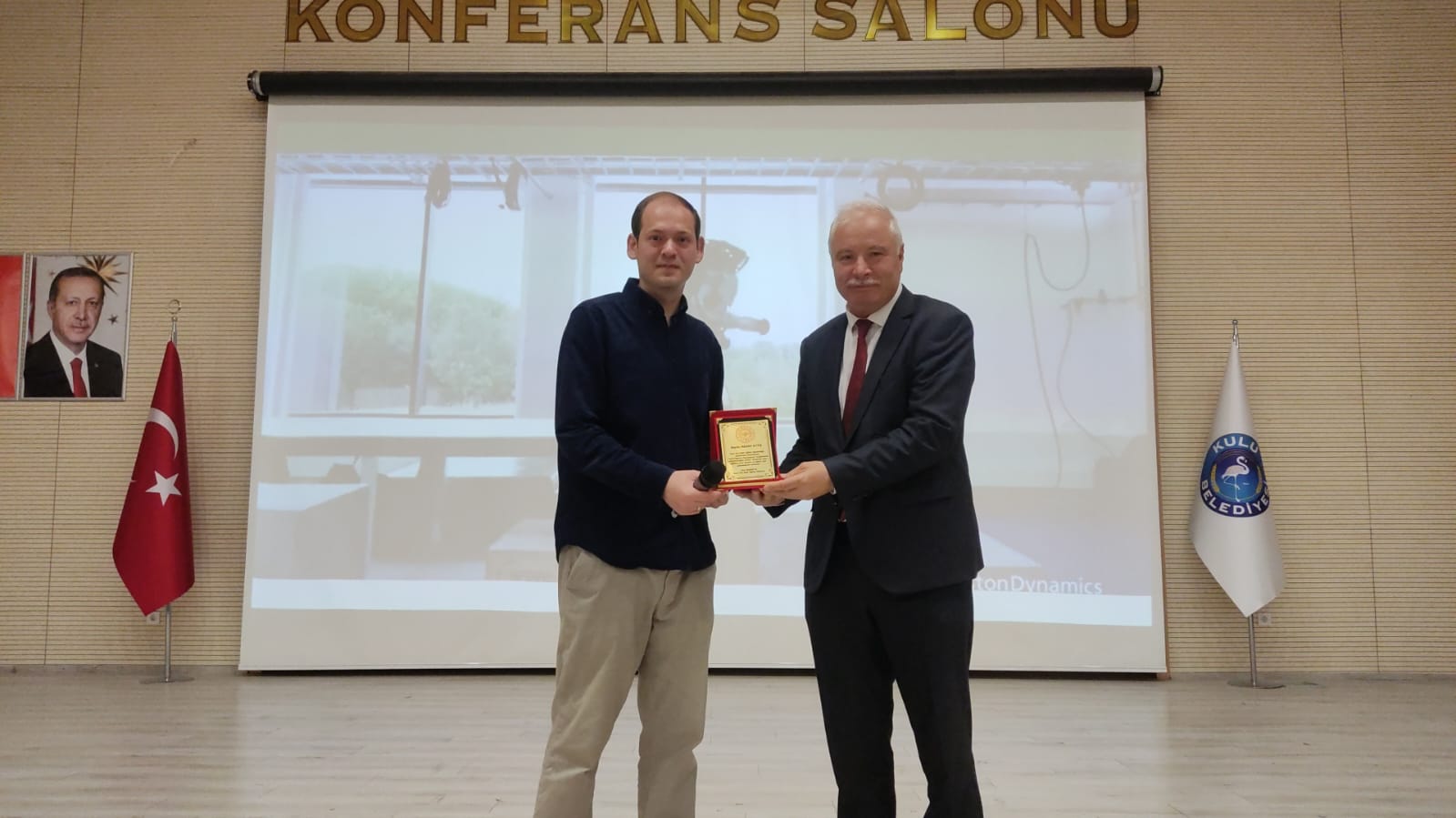 Etkinliğin sonunda İlçe Milli Eğitim Müdürü Bakırtaş, katkılarından dolayı Öğretmen-Yazar Hasan Aytiş’e teşekkür plaketi takdim etti. (Veli Şengül)