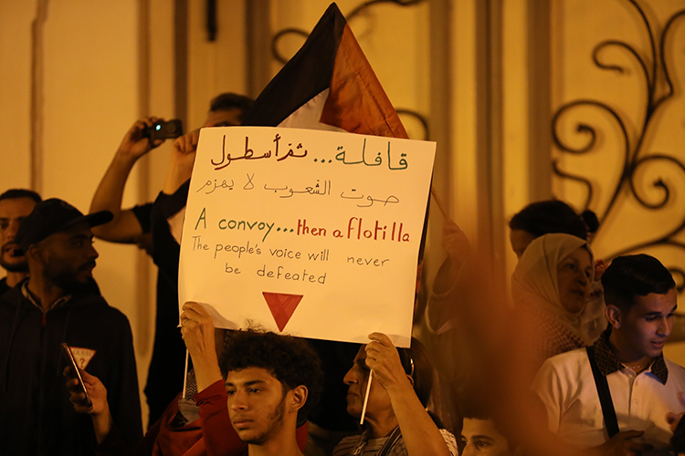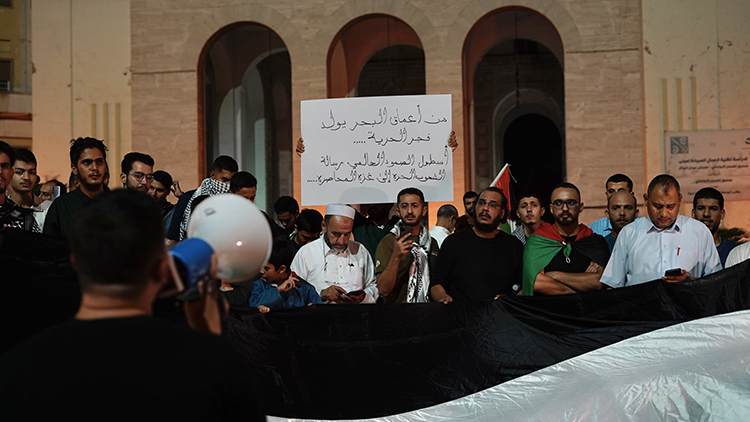 Trablus'taki Cezayir Meydanı'nda toplanan çok sayıda Libyalı, Filistin ve Libya bayrakları taşıyarak İsrail'i protesto eden sloganlar attı. Göstericiler, "Denizin derinliklerinden özgürlük sabahı doğacak" ve "Küresel Sumud Filosu özgür halkların abluka altındaki Gazze'ye mesajı'" yazılı dövizler taşıdı.