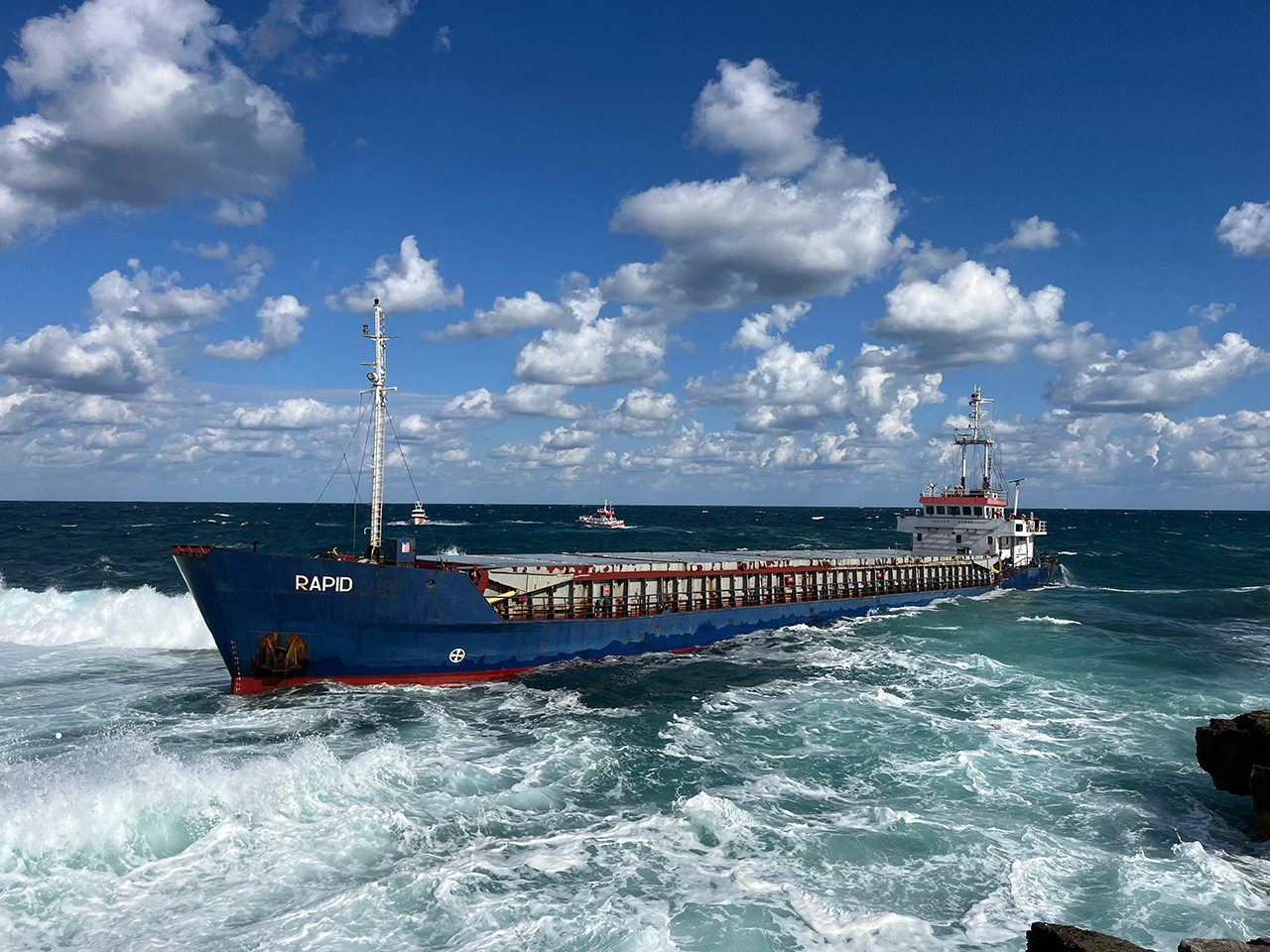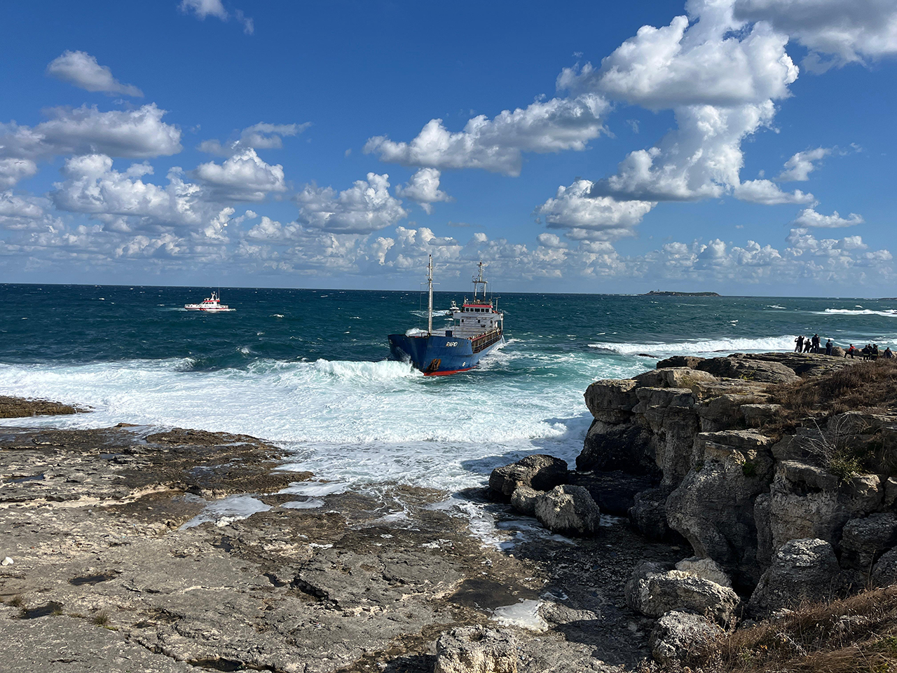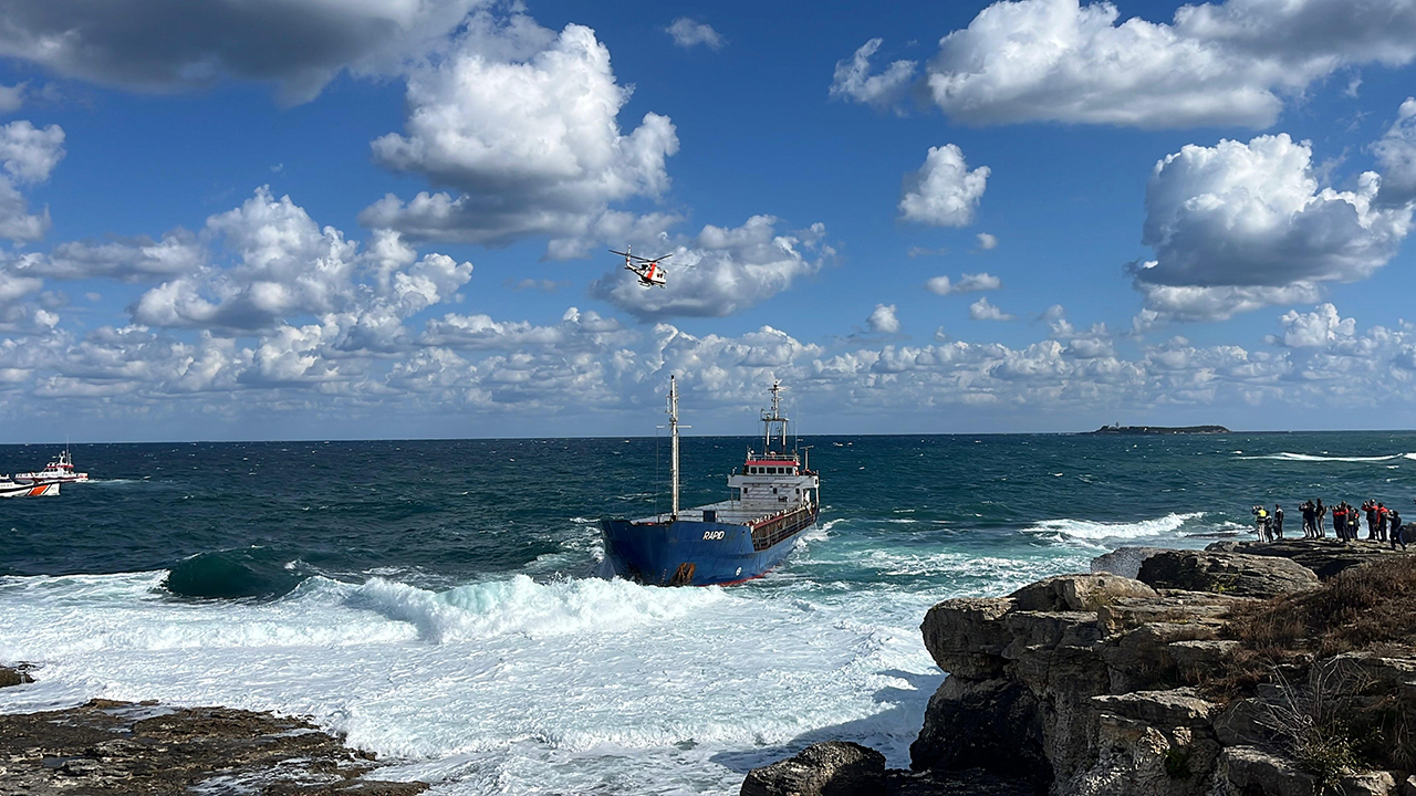 Kuru yük gemisi daha sonra kıyıdaki kayalık bölgede karaya oturdu. Yedi kişilik mürettebatı bulunan geminin kurtarılması için ekiplerce çalışma başlatıldı.