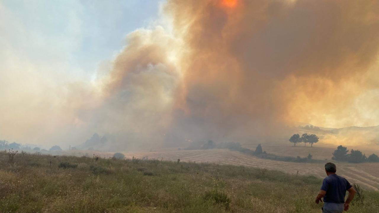 Ekili tarım arazilerine de sıçrayan yangını söndürmek için havadan ve karadan müdahale sürüyor.