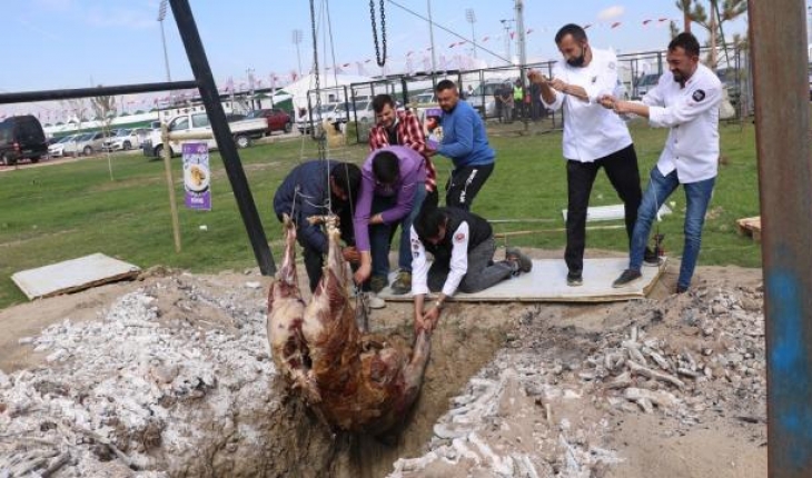 Afyonkarahisar'da düzenlenen Gastro Afyon Turizm ve Lezzet Festivali'nde 2 ton ağırlığındaki dana, aşçılar tarafından dikey şekilde pişirilmek istenirken çukura düştü.