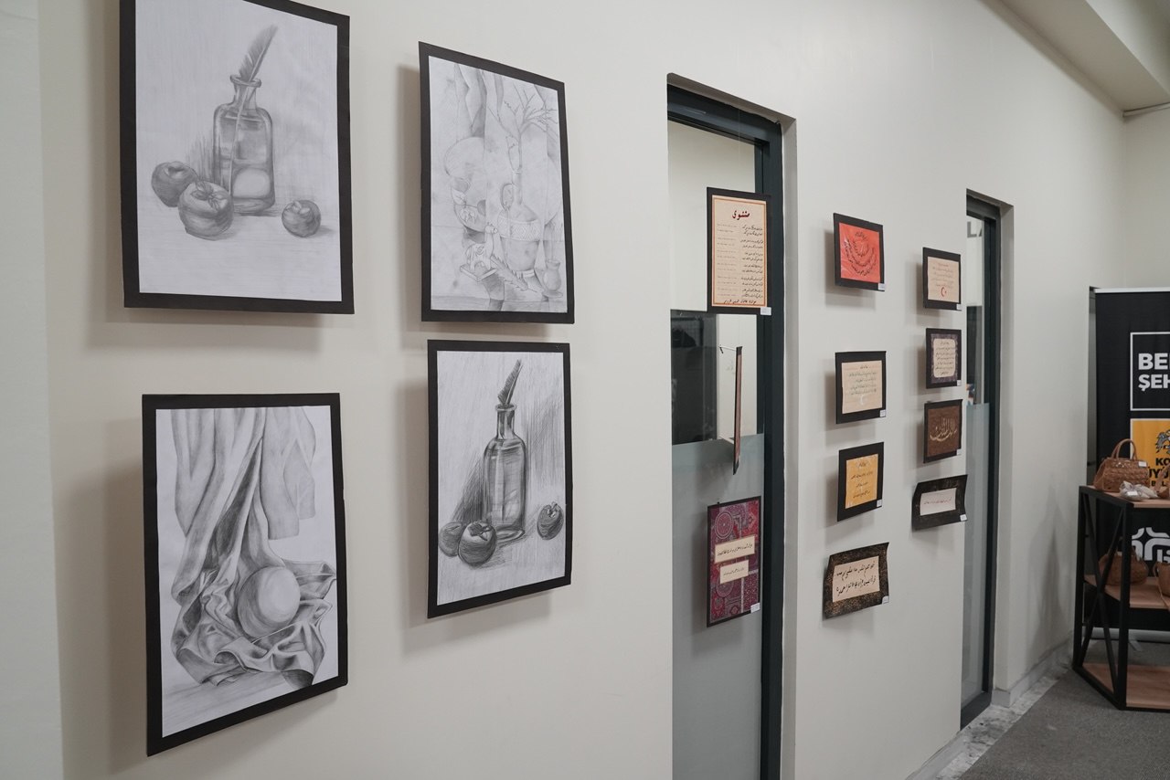 Ebru Atölyesi’nde hazırlanan özgün ebru çalışmaları, Minyatür ve Hüsn-i Hat Atölyelerinde üretilen eserler, Görsel Sanatlar Atölyesi öğrencilerinin karakalem ve pastel çalışmaları sergi alanında yer aldı. Zarafet Atölyesi’nde hazırlanan el emeği ürünler de ziyaretçilerin ilgisini çekti.