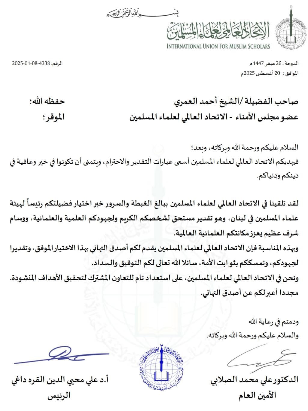 Uluslararası Müslüman Alimler Birliği Başkanı Dr. Ali Muhyiddin el-Karadaği’de Mütevelli Heyeti Üyelerinden olan Şeyh Ahmed el-Ömeri’nin başkan seçilmesi üzerine resmi bir açıklama yaparak “Birliğimiz olarak, Lübnan'daki Alimler Heyeti'ne başkan olarak seçilmenizden büyük bir mutluluk ve sevinç duyduğumuzu belirtmek isteriz. Bu seçim, ilminize ve ahlakınıza duyulan saygının bir göstergesidir. Size verilen bu yüce makam, alimler camiasındaki üstün konumunuzu pekiştirmektedir.” dedi.