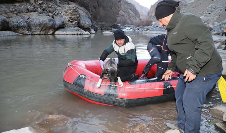 Bunun üzerine bölgeye yönlendirilen Afet ve Acil Durum (AFAD), Hakkari Belediyesi Veteriner İşleri ile Gençlik ve Spor İl müdürlüklerine bağlı ekipler, şişirdikleri botla suyun karşısına geçti.