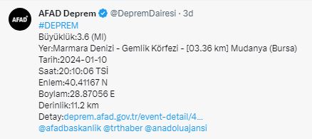 AFAD'ın yer vermiş olduğu bilgiye göre saat 20.10'da Marmara Denizi - Gemlik Körfezi'nde 3.6 büyüklüğünde deprem meydana geldi.